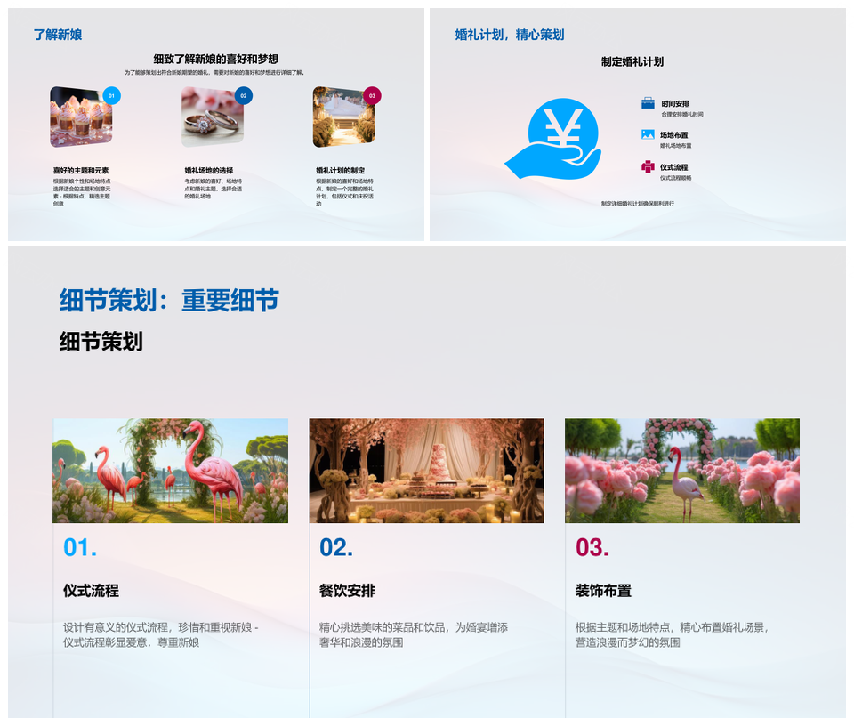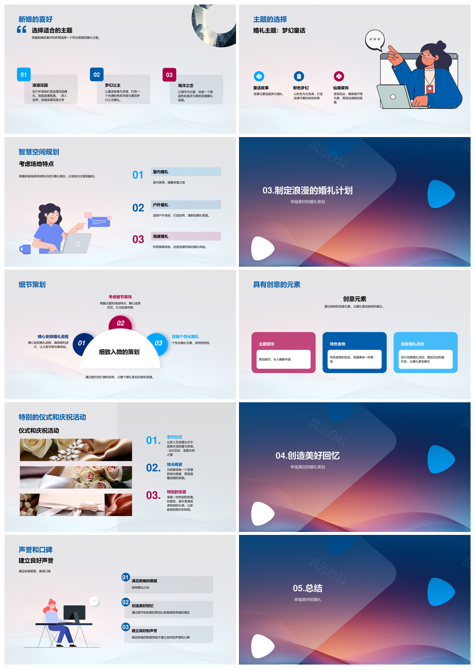 这是一张浪漫婚礼策划方案PPT模板,包含浪漫、婚礼、策划、方案等主题内容,也可用作浪漫婚礼策划方案、浪漫婚礼策划、浪漫婚礼方案、婚礼策划方案、浪漫婚礼、婚礼策划、策划方案、婚礼方案、浪漫策划、浪漫策划方案、策划方案婚礼、婚礼方案策划、方案策划婚礼、方案浪漫婚礼、浪漫方案婚礼等PPT场景使用。 风云办公提供的浪漫婚礼策划方案PPT模板,下载格式为pptx,一共21页,作品中文字及图均可以修改和编辑,图片更改请在作品中右键图片并更换,文字修改请直接点击文字进行修改。