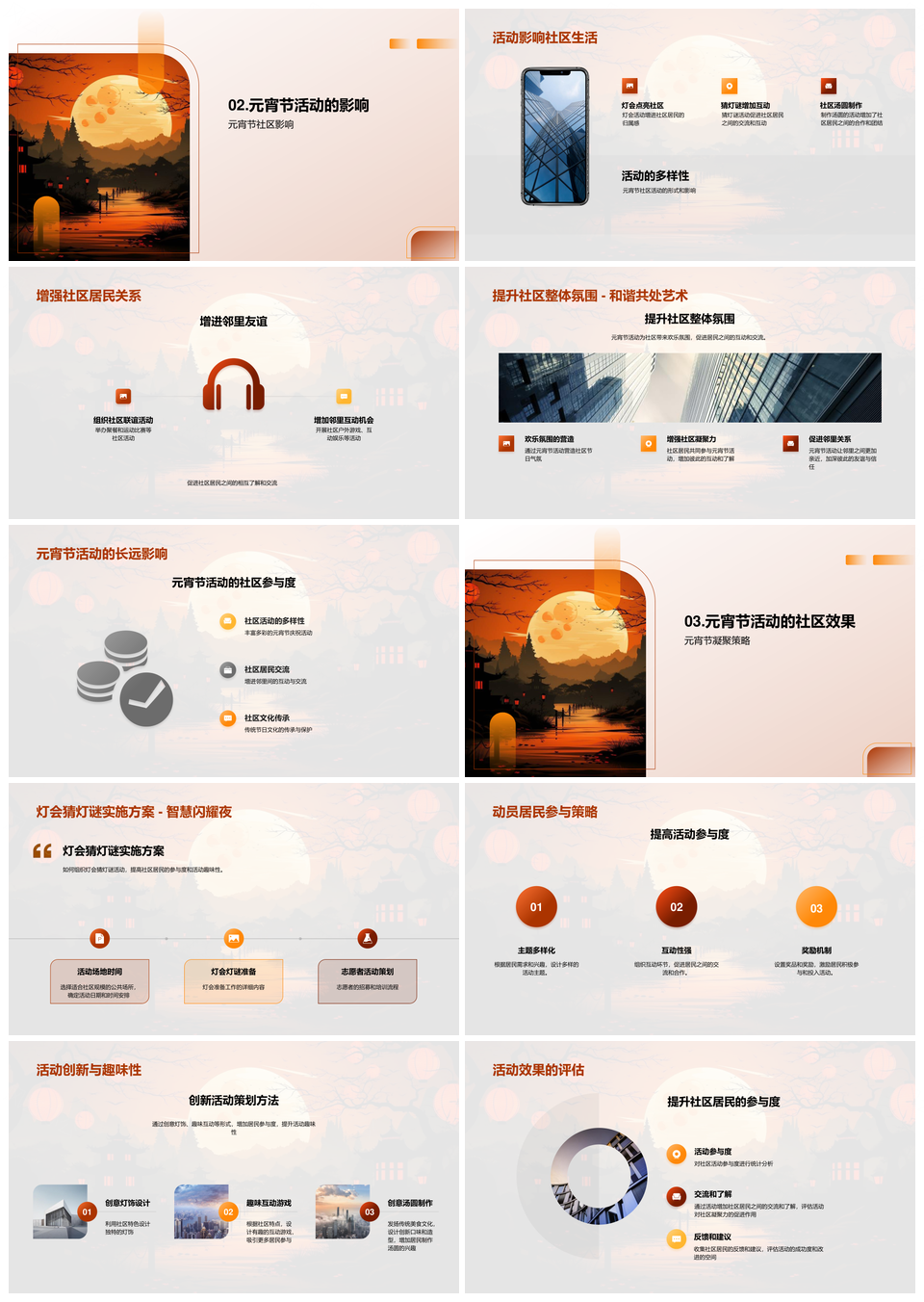 这款PPT模板以传统元宵节文化为核心,创新融合现代科技美学,设计理念源自光的波粒二象性原理,通过激光质感线条与灯笼元素结合,诠释传统节日的未来感。模版内嵌灯会场景插画、灯谜文化符号、社区活动架构图等专业模块,支持民俗展示与现代议题并行的逻辑框架,适用于社区文化活动策划、非遗传承研究等场景。采用模块化图文排版,通过红金渐变色系平衡传统节日氛围与学术专业感,完整覆盖节日溯源、文化肌理分析、活动执行方案等章节需求。