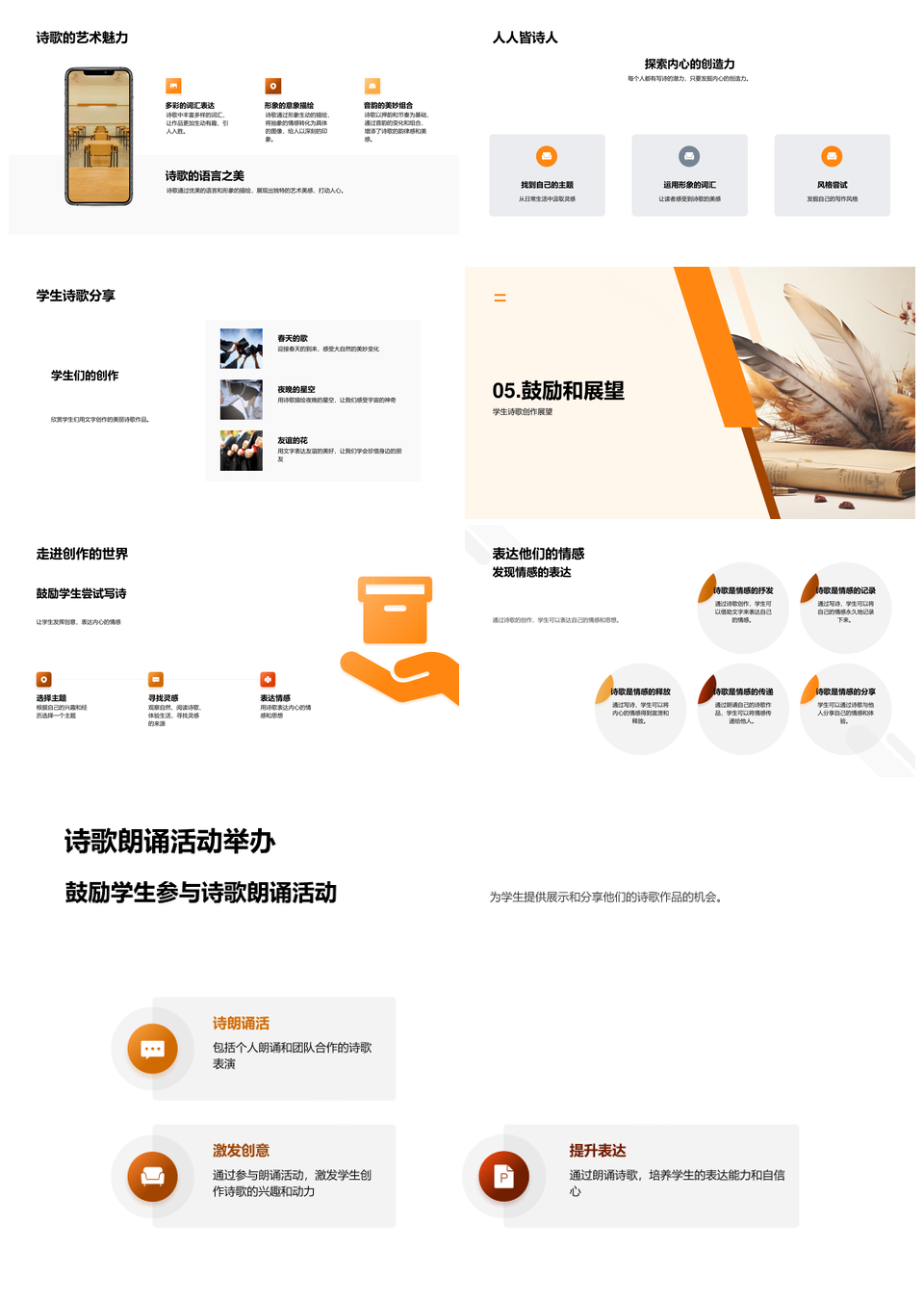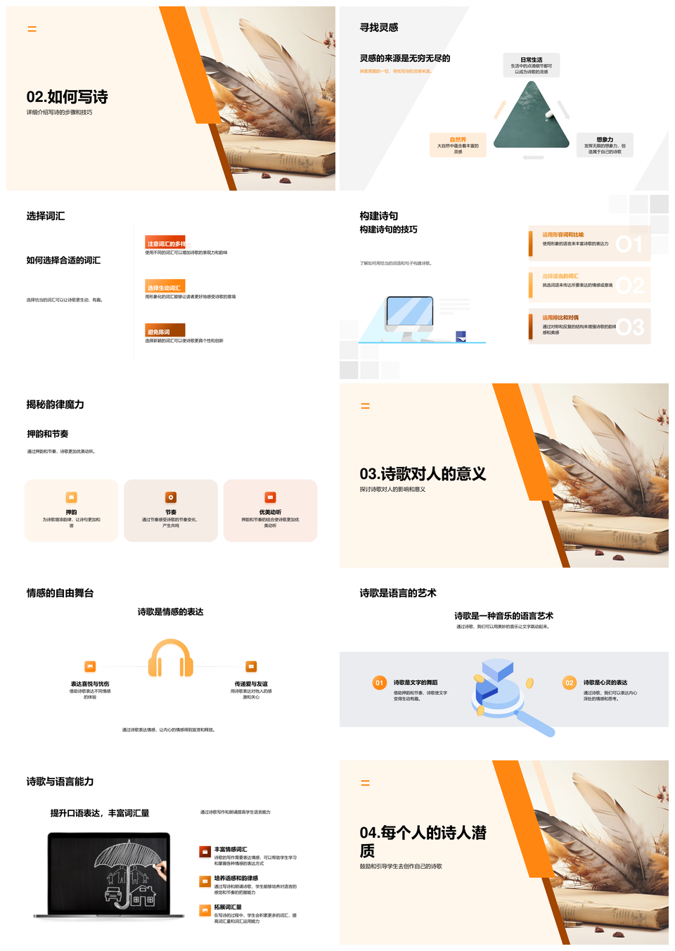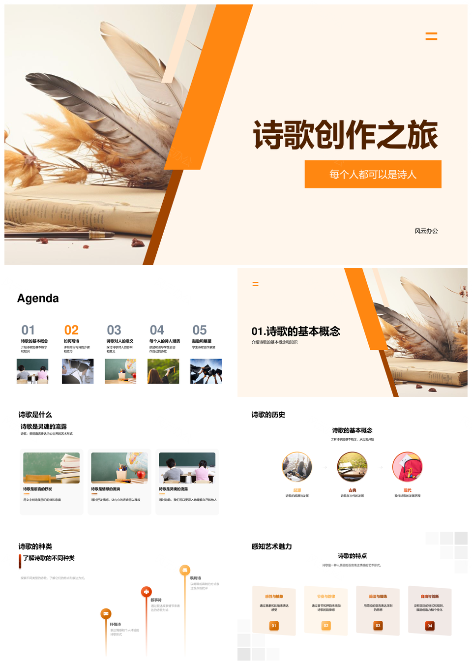 风云办公提供的诗歌创作史类步骤灵感词汇诗句羽毛笔PPT模板,下载格式为pptx,一共25页,作品中文字及图均可以修改和编辑,图片更改请在作品中右键图片并更换,文字修改请直接点击文字进行修改。