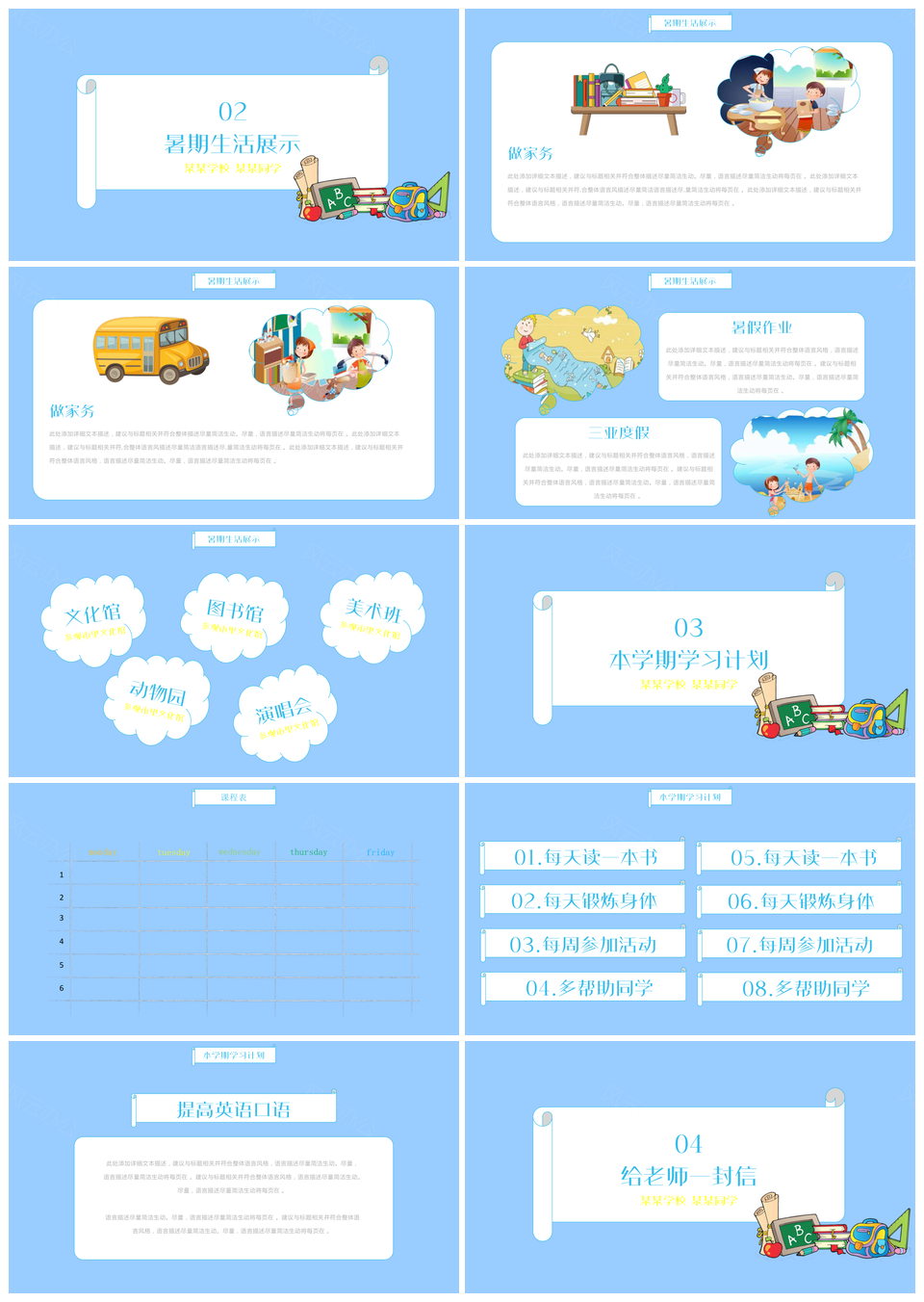 这是一张卡通新学期主题班会PPT模板,包含卡通、新学期、主题班会等主题内容,也可用作卡通、新学期、主题、班会 卡通新学期主题班会、新学期主题班会、卡通主题班会、主题班会、卡通新学期、新学期班会、卡通班会、卡通主题、新学期主题等PPT场景使用。 风云办公提供的卡通新学期主题班会PPT模板,下载格式为pptx,一共20页,作品中文字及图均可以修改和编辑,图片更改请在作品中右键图片并更换,文字修改请直接点击文字进行修改。