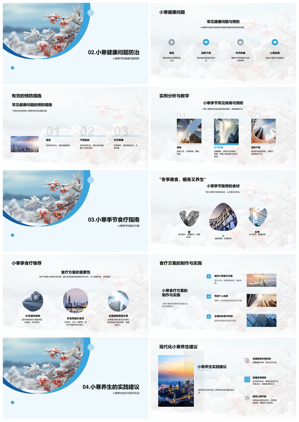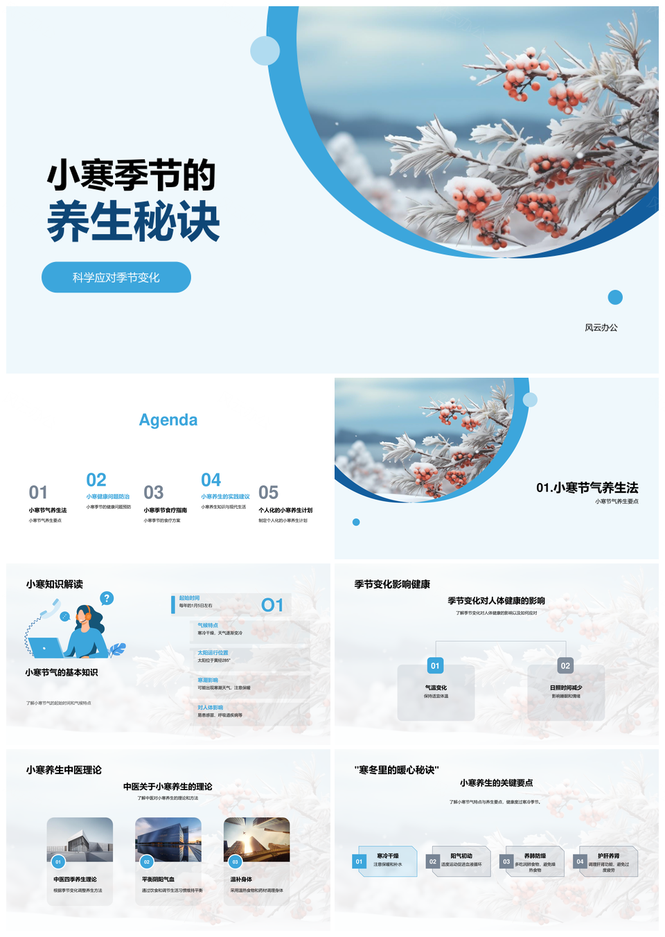 风云办公提供的小寒中医食疗防季节病养生调养PPT模板,下载格式为pptx,一共24页,作品中文字及图均可以修改和编辑,图片更改请在作品中右键图片并更换,文字修改请直接点击文字进行修改。