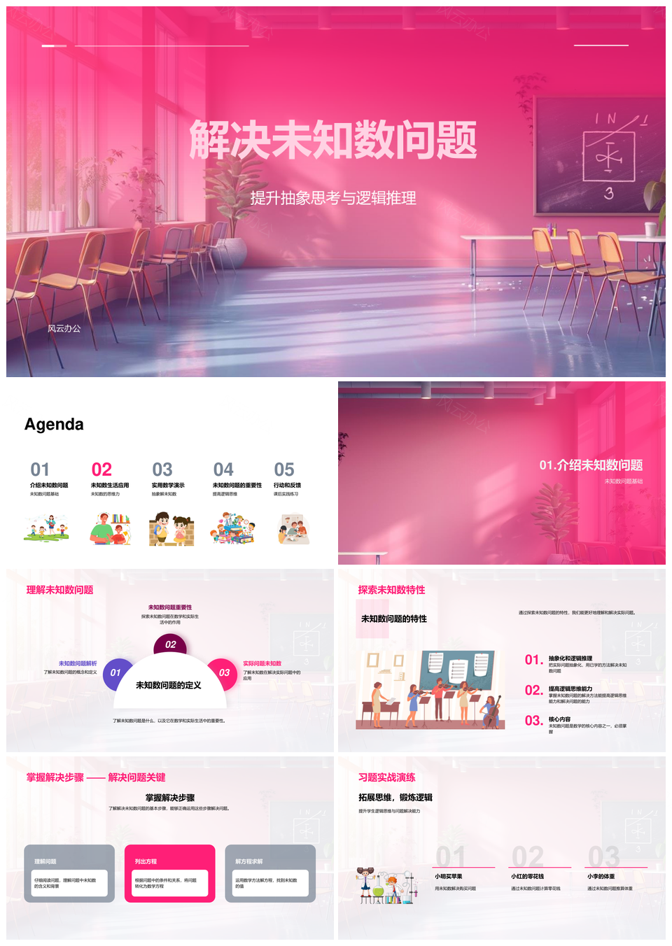 风云办公提供的数学抽象逻辑解决未知数教学课件,下载格式为pptx,一共33页,作品中文字及图均可以修改和编辑,图片更改请在作品中右键图片并更换,文字修改请直接点击文字进行修改。