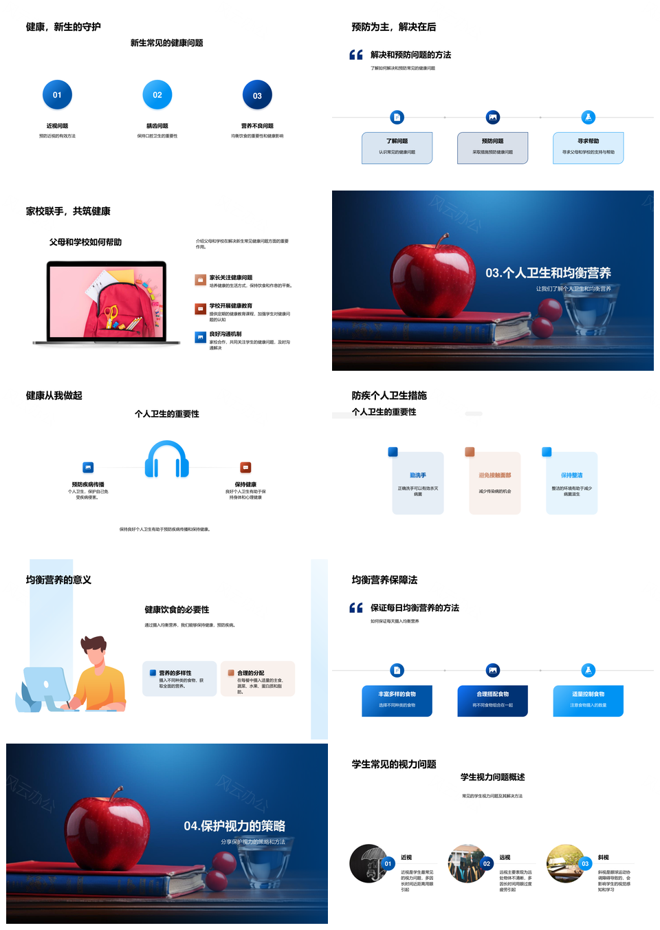 这是一张一年级新生健康习惯营养均衡视力保健指导PPT模板,包含一年级、新生、健康习惯、营养均衡、视力保健、指导等主题内容,也可用作一年级新生健康习惯营养均衡视力保健、新生健康习惯营养均衡视力保健指导、一年级新生健康习惯营养均衡、新生健康习惯营养均衡视力保健、健康习惯营养均衡视力保健指导、一年级新生健康习惯视力保健、一年级健康习惯营养均衡视力保健、一年级新生营养均衡视力保健、新生营养均衡视力保健指导、健康习惯营养均衡视力保健、一年级新生健康习惯指导、健康习惯营养均衡视力保健、新生健康习惯营养均衡指导、健康习惯营养均衡指导、营养均衡视力保健指导等PPT场景使用。 风云办公提供的一年级新生健康习惯营养均衡视力保健指导PPT模板,下载格式为pptx,一共26页,作品中文字及图均可以修改和编辑,图片更改请在作品中右键图片并更换,文字修改请直接点击文字进行修改。