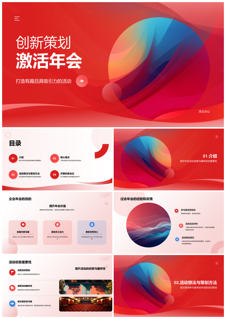 风云办公提供的商务企业年会创意趣味创新活动策划PPT模板,下载格式为pptx,一共22页,作品中文字及图均可以修改和编辑,图片更改请在作品中右键图片并更换,文字修改请直接点击文字进行修改。