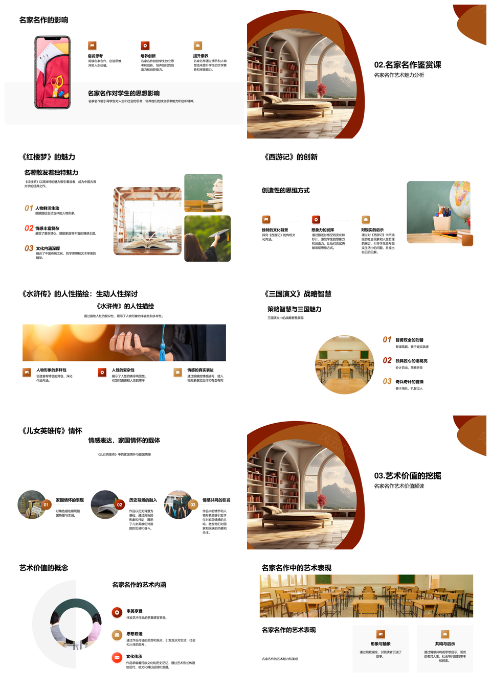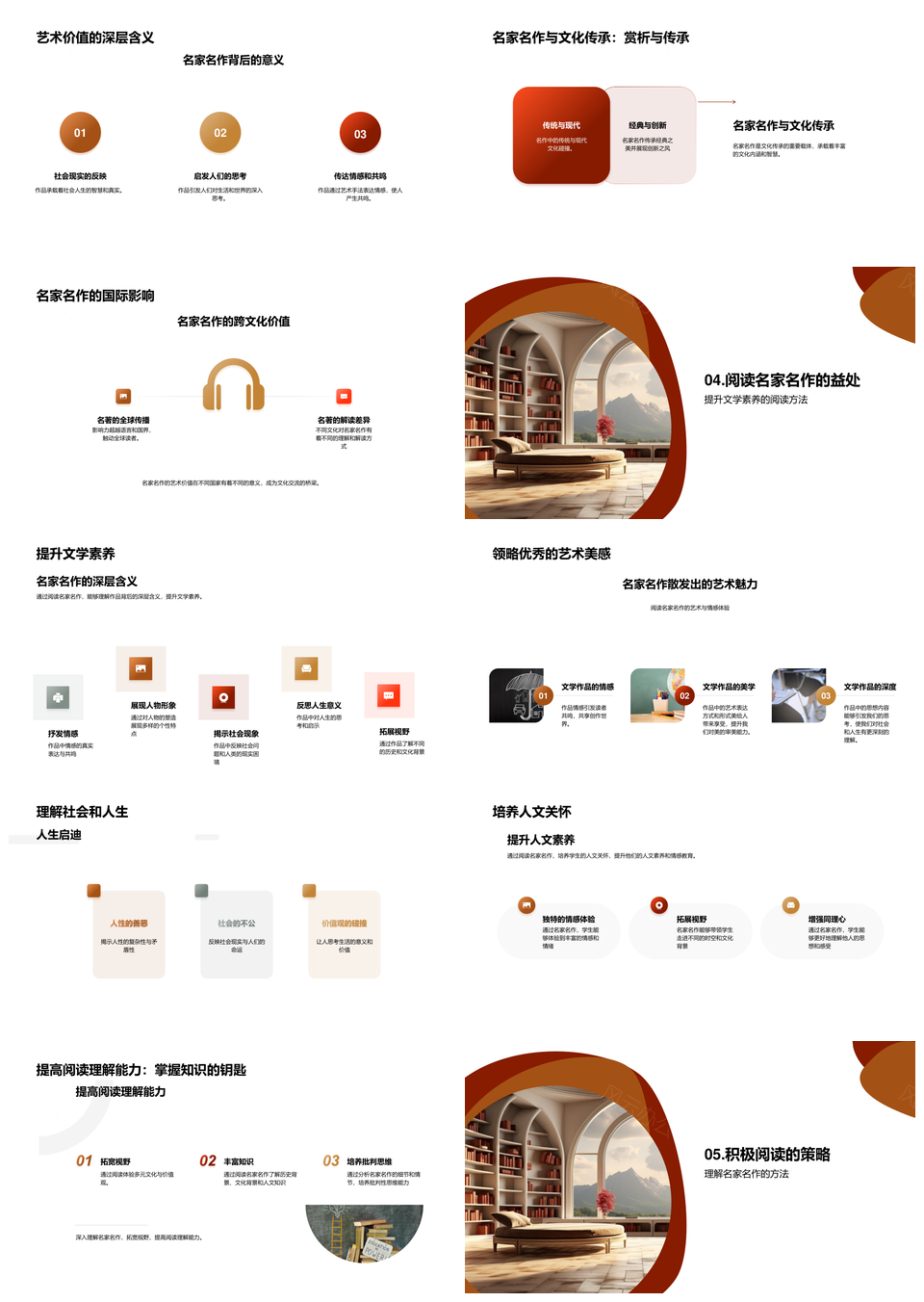 这是一张品读经典名著提升文学素养赏析艺术价值PPT模板,包含经典名著、文学素养、艺术价值等主题内容,也可用作品读经典文学艺术、名著提升文学素养、品读经典名著、提升文学素养、赏析艺术价值、经典文学素养、文学赏析艺术、提升艺术价值、品读艺术价值、品读经典、经典名著、提升文学、文学素养、赏析艺术、艺术价值等PPT场景使用。 风云办公提供的品读经典名著提升文学素养赏析艺术价值PPT模板,下载格式为pptx,一共33页,作品中文字及图均可以修改和编辑,图片更改请在作品中右键图片并更换,文字修改请直接点击文字进行修改。