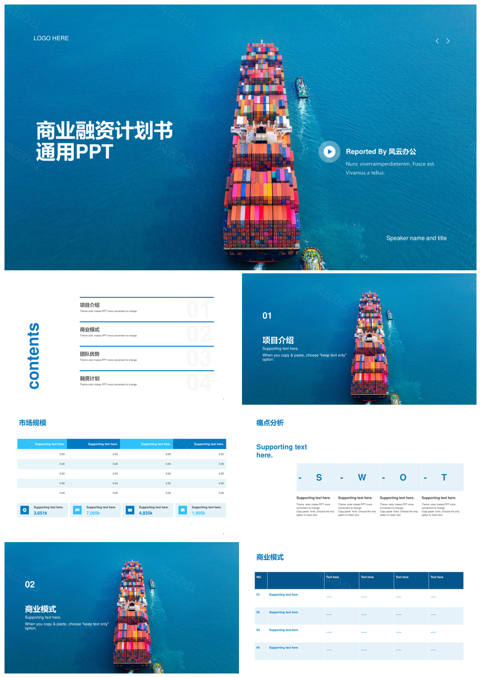 风云办公提供的蓝色现代海运货运商务运输计划PPT模板,下载格式为pptx,一共15页,作品中文字及图均可以修改和编辑,图片更改请在作品中右键图片并更换,文字修改请直接点击文字进行修改。