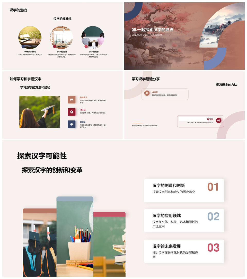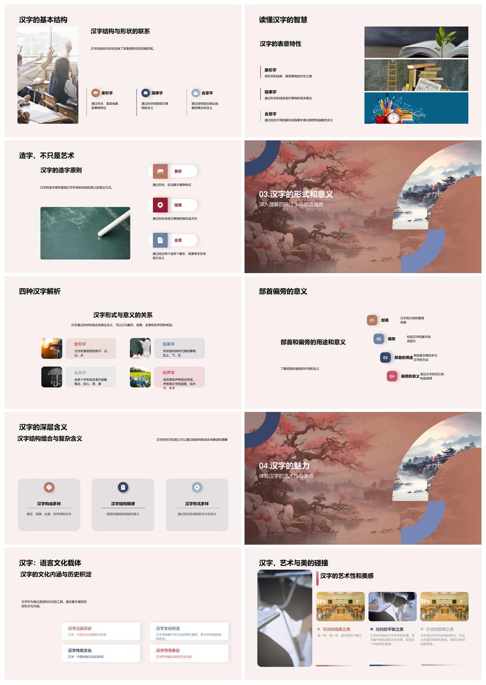 风云办公提供的汉字艺术性起源历史演变结构表意造字PPT模板,下载格式为pptx,一共23页,作品中文字及图均可以修改和编辑,图片更改请在作品中右键图片并更换,文字修改请直接点击文字进行修改。