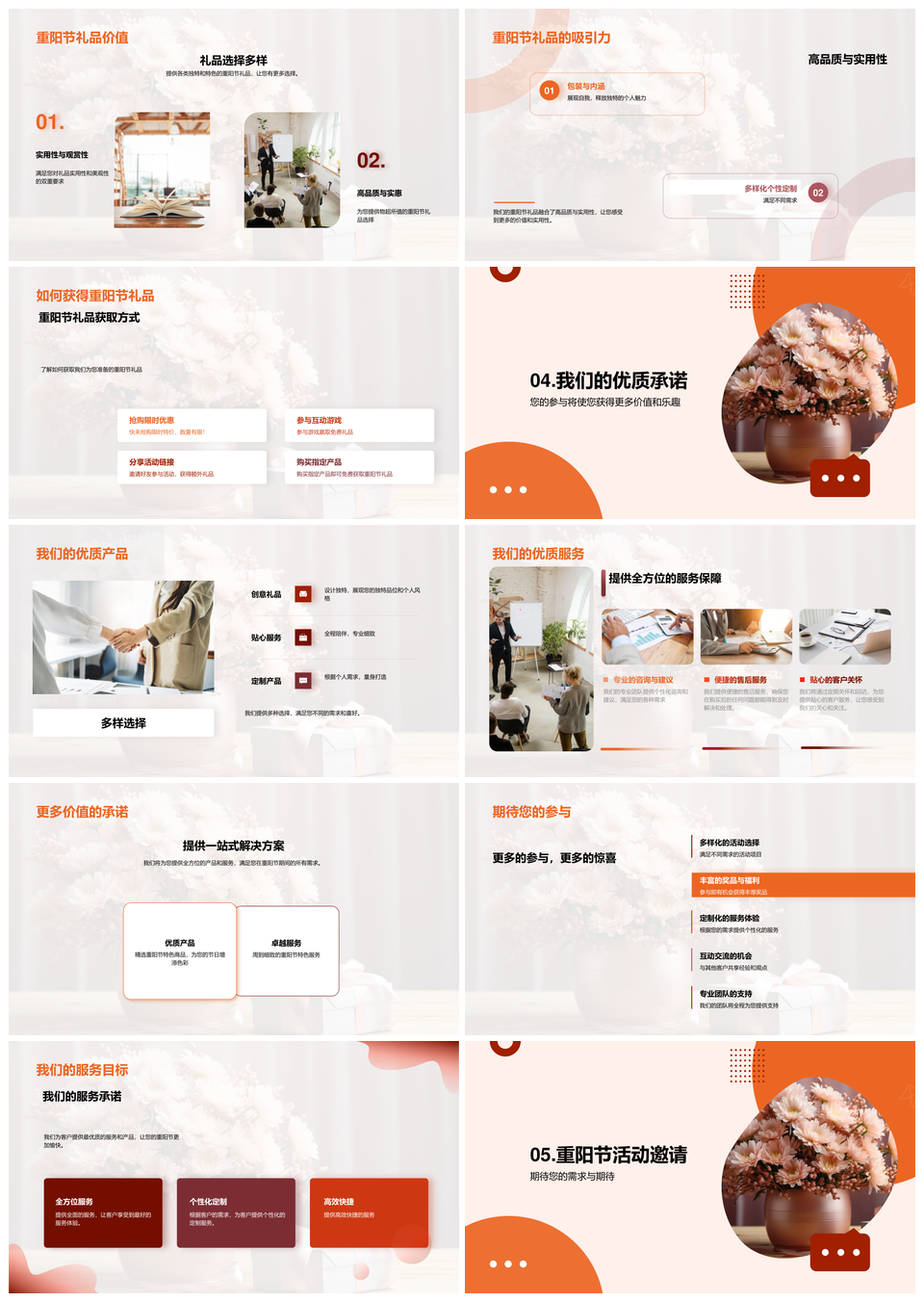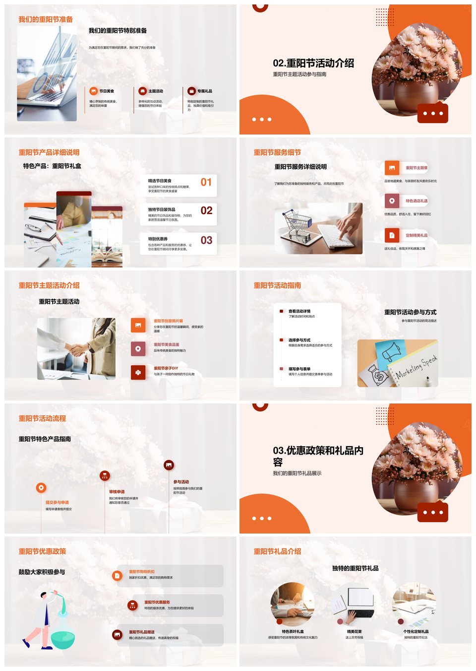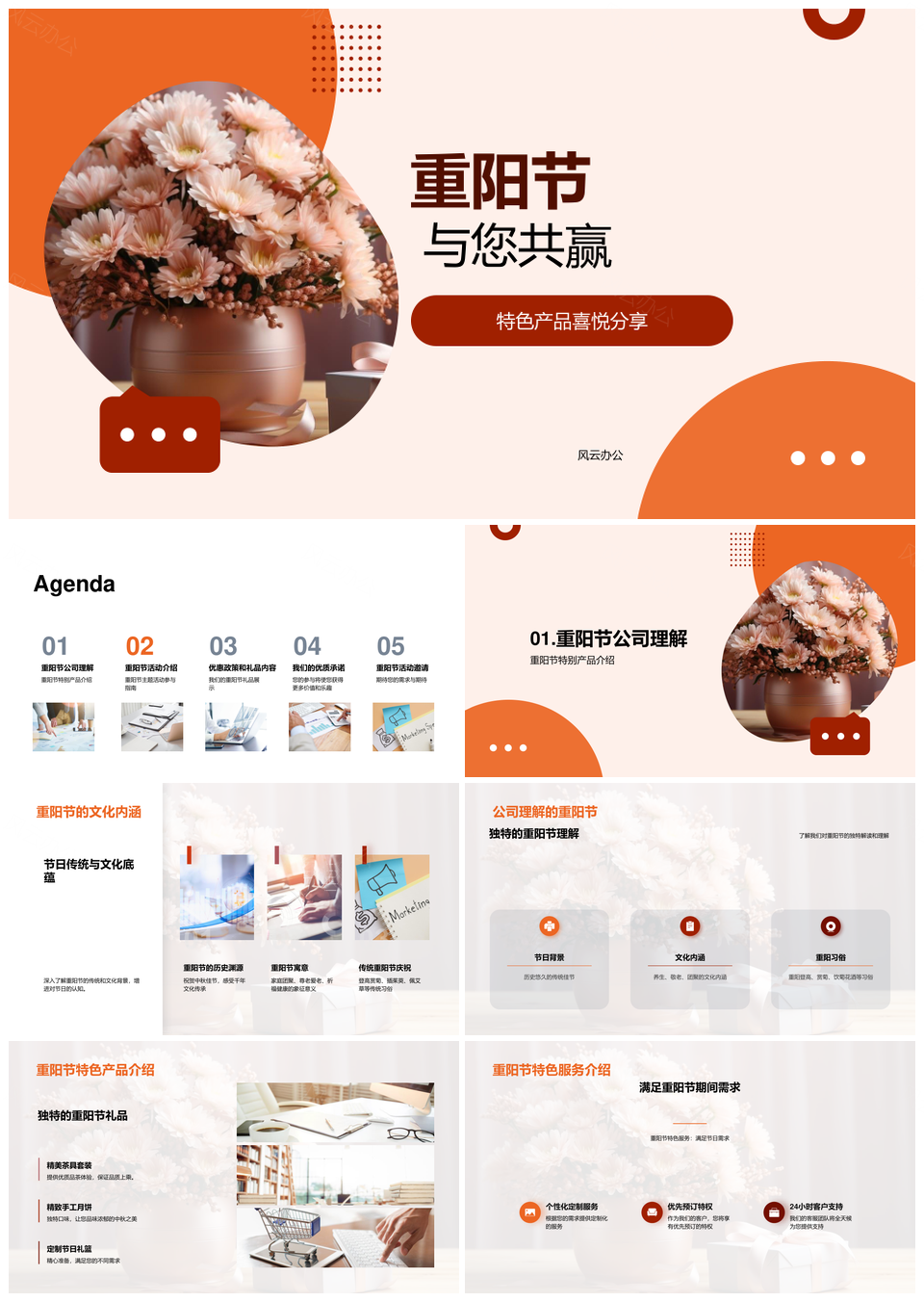 风云办公提供的重阳菊花礼品特色营销惠客主题活动PPT模板,下载格式为pptx,一共33页,作品中文字及图均可以修改和编辑,图片更改请在作品中右键图片并更换,文字修改请直接点击文字进行修改。