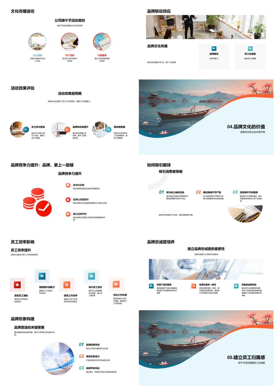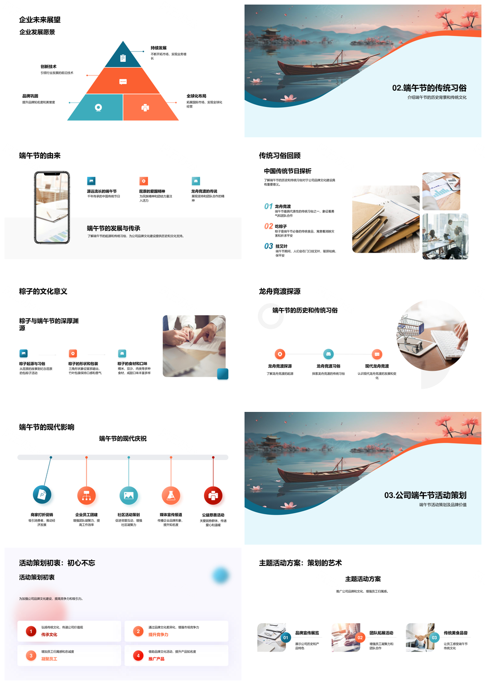 风云办公提供的端午龙舟传承企业文化凝聚品牌归属PPT模板,下载格式为pptx,一共33页,作品中文字及图均可以修改和编辑,图片更改请在作品中右键图片并更换,文字修改请直接点击文字进行修改。