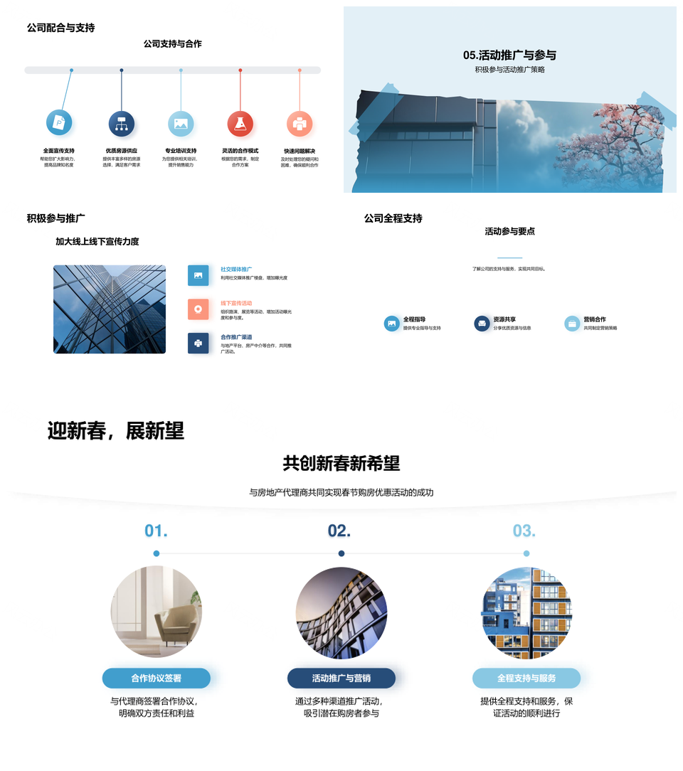 这是一张春节房企代理优惠促销售目标活动推广精选房源建筑新希望PPT模板,包含房企、代理、优惠、促销、目标、活动、推广、精选、房源、建筑、新希望等主题内容,也可用作房企代理优惠促销、优惠促销销售目标活动、促销销售目标活动推广、活动推广精选房源建筑新希望、代理优惠促销、优惠促销销售目标、活动推广精选房源、推广精选房源建筑新希望、春节房企、房企代理、优惠促销、促销销售目标、活动推广、精选房源、建筑新希望等PPT场景使用。 风云办公提供的春节房企代理优惠促销售目标活动推广精选房源建筑新希望PPT模板,下载格式为pptx,一共23页,作品中文字及图均可以修改和编辑,图片更改请在作品中右键图片并更换,文字修改请直接点击文字进行修改。