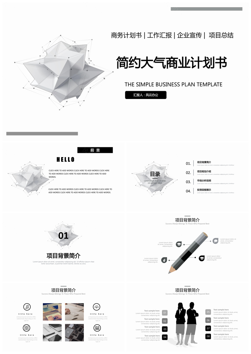 这是一张简约大气商业计划书PPT模板,包含简约、大气、商业计划书等主题内容,也可用作简约、大气、商业、计划书 简约大气商业计划书、简约大气计划书、简约商业计划书、大气商业计划书、商业计划书、简约大气、大气计划书、简约计划书等PPT场景使用。 风云办公提供的简约大气商业计划书PPT模板,下载格式为pptx,一共22页,作品中文字及图均可以修改和编辑,图片更改请在作品中右键图片并更换,文字修改请直接点击文字进行修改。
