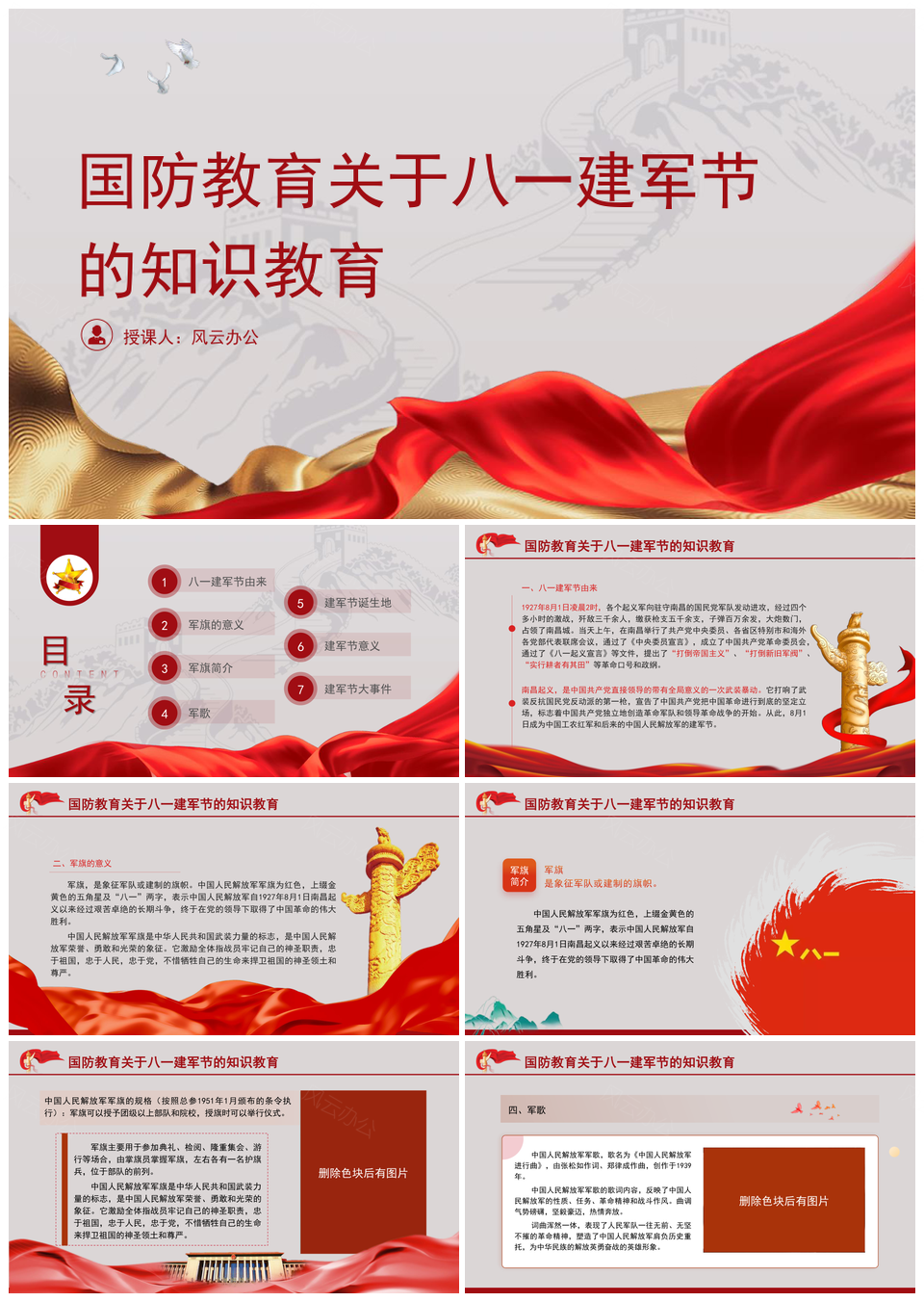 风云办公提供的国防教育八一建军节知识教育学习专题PPT模板,下载格式为pptx,一共13页,作品中文字及图均可以修改和编辑,图片更改请在作品中右键图片并更换,文字修改请直接点击文字进行修改。
