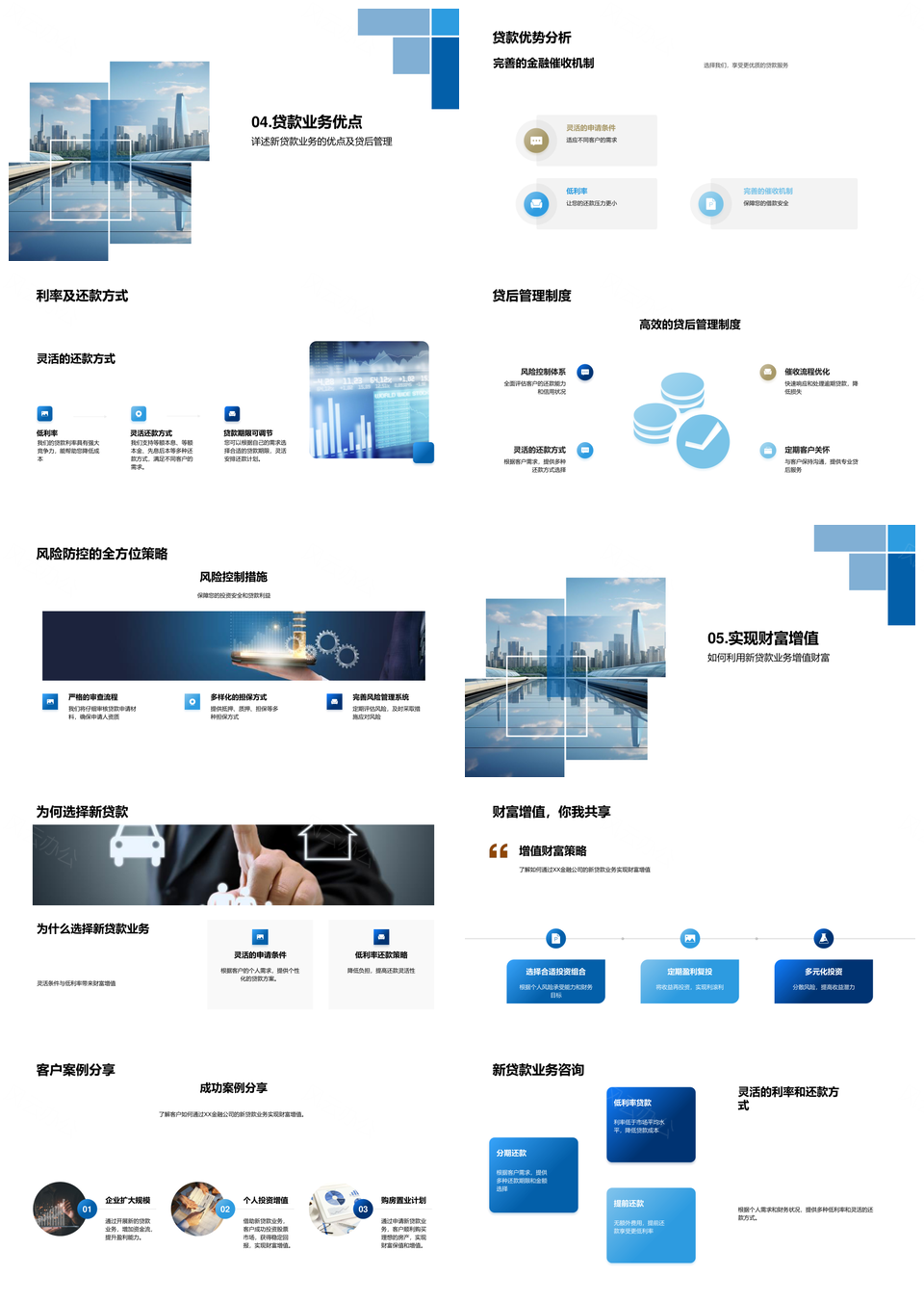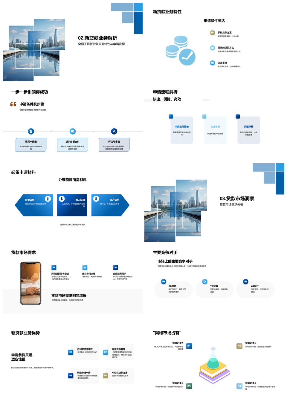 这是一张XX金融新贷业务优势服务解析市场竞争分析PPT模板,包含XX金融、新贷业务、优势服务、解析、市场竞争、分析等主题内容,也可用作XX金融新贷业务优势服务、新贷业务优势服务解析、业务优势服务解析市场、优势服务解析市场竞争、服务解析市场竞争分析、XX金融新贷业务优势、新贷业务优势服务、业务优势服务解析、优势服务解析市场、服务解析市场竞争、解析市场竞争分析、XX金融新贷业务、新贷业务优势、业务优势服务、市场竞争分析等PPT场景使用。 风云办公提供的XX金融新贷业务优势服务解析市场竞争分析PPT模板,下载格式为pptx,一共28页,作品中文字及图均可以修改和编辑,图片更改请在作品中右键图片并更换,文字修改请直接点击文字进行修改。