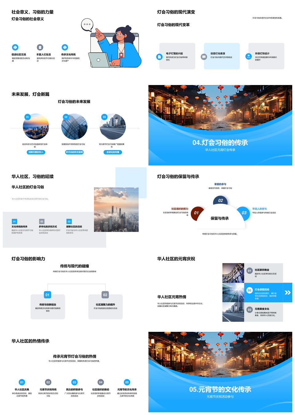 风云办公提供的华人社区元宵灯会彩灯祈福传统习俗PPT模板,下载格式为pptx,一共33页,作品中文字及图均可以修改和编辑,图片更改请在作品中右键图片并更换,文字修改请直接点击文字进行修改。