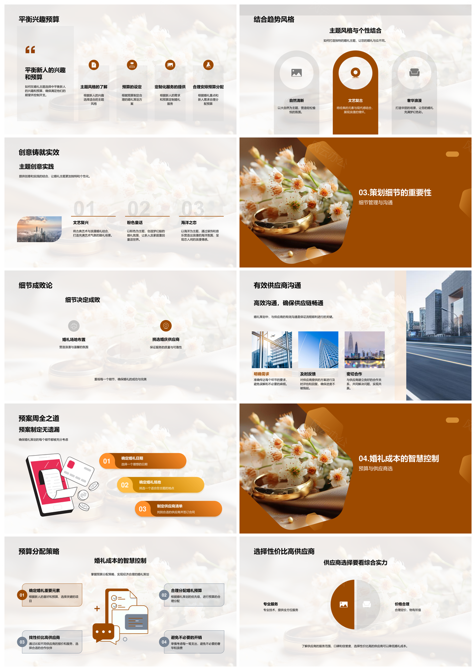 这是一张婚礼趋势个性主题预算成本供应商细节婚戒攻略PPT模板,包含婚礼、趋势、个性、主题、预算、成本、供应商、细节、婚戒、攻略等主题内容,也可用作婚礼趋势个性主题预算、个性主题预算成本供应商、预算成本供应商细节婚戒、婚礼趋势主题预算成本、婚戒攻略供应商细节预算、个性婚礼主题预算攻略、供应商细节婚戒攻略成本、婚礼趋势婚戒攻略细节、主题预算成本婚戒细节、趋势个性婚戒攻略预算、婚戒供应商预算成本、婚礼主题个性趋势、预算成本攻略细节、供应商婚戒细节、婚礼趋势预算等PPT场景使用。 风云办公提供的婚礼趋势个性主题预算成本供应商细节婚戒攻略PPT模板,下载格式为pptx,一共24页,作品中文字及图均可以修改和编辑,图片更改请在作品中右键图片并更换,文字修改请直接点击文字进行修改。