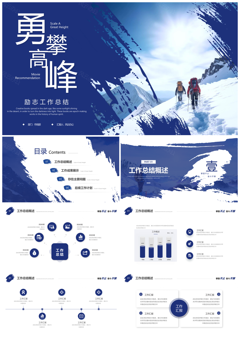 蓝色励志攀登笔刷风多部门年度工作总结述职报告PPT模板推荐