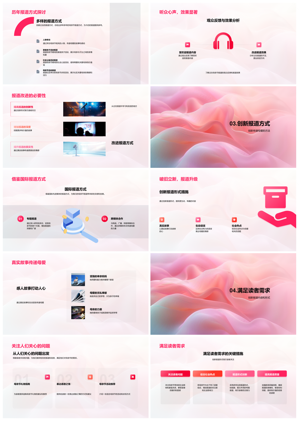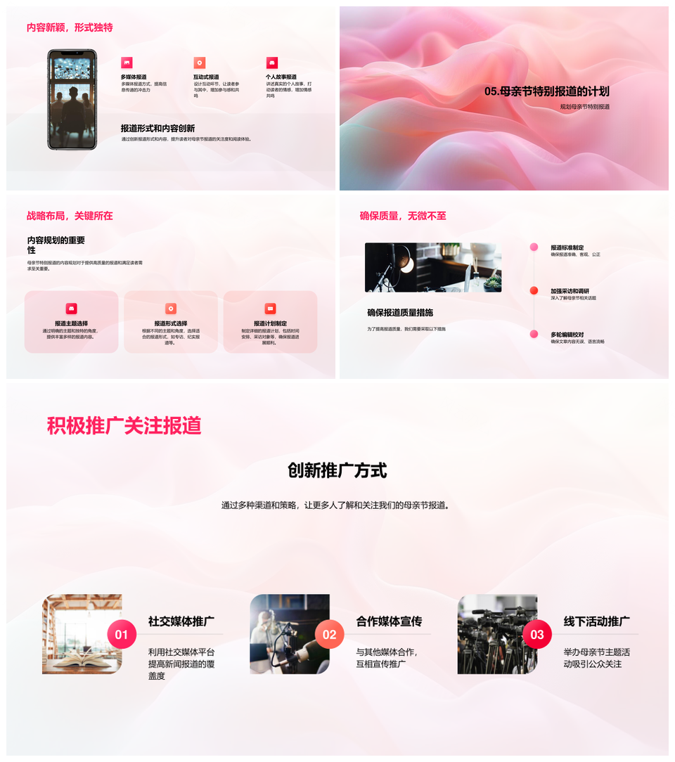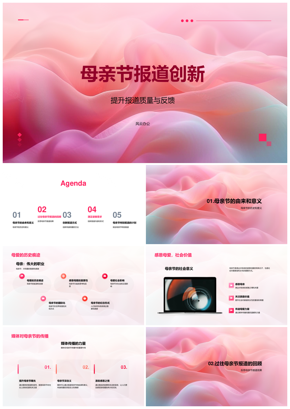风云办公提供的母亲节报道创新质量反馈历史社会意义PPT模板,下载格式为pptx,一共23页,作品中文字及图均可以修改和编辑,图片更改请在作品中右键图片并更换,文字修改请直接点击文字进行修改。