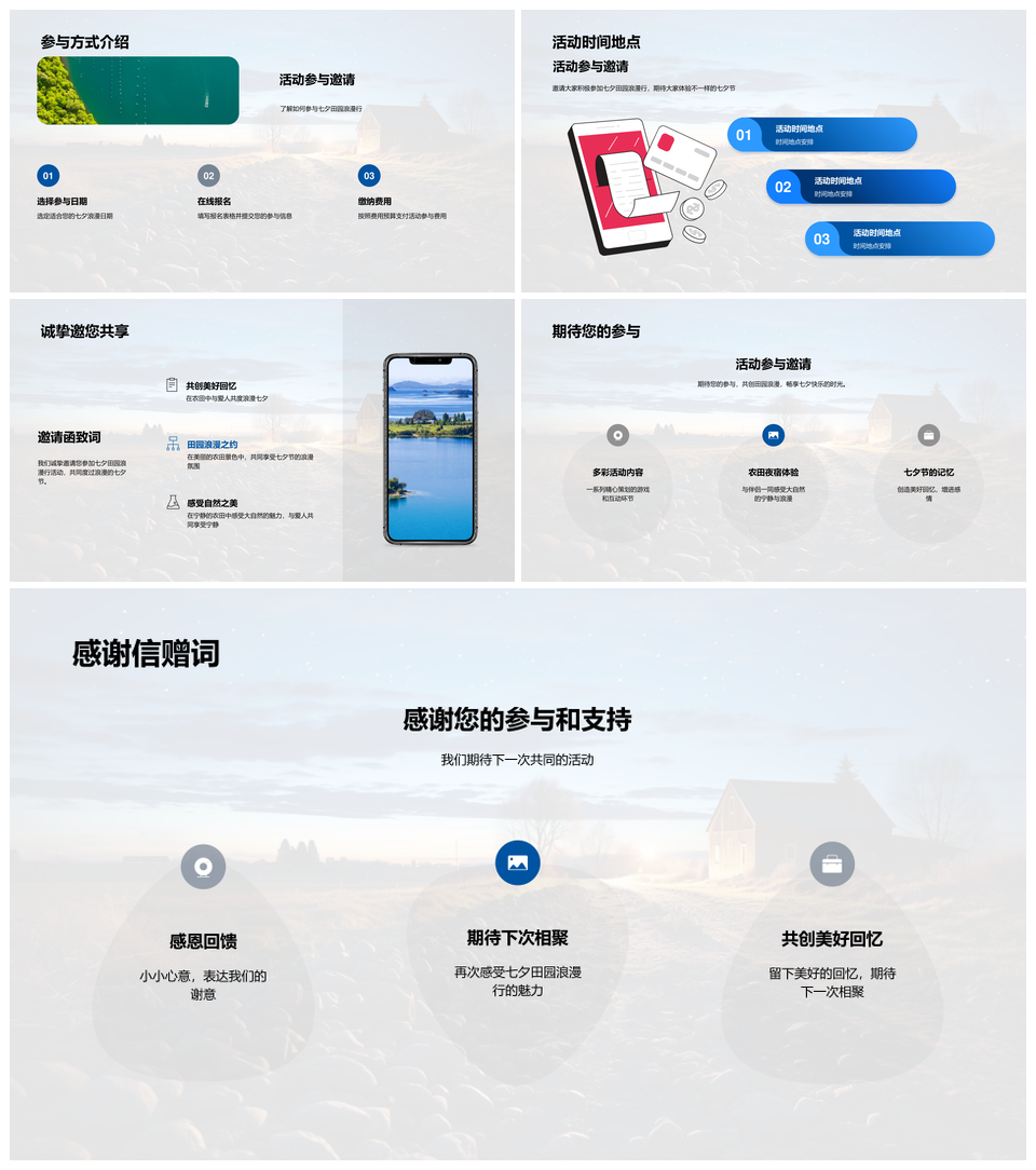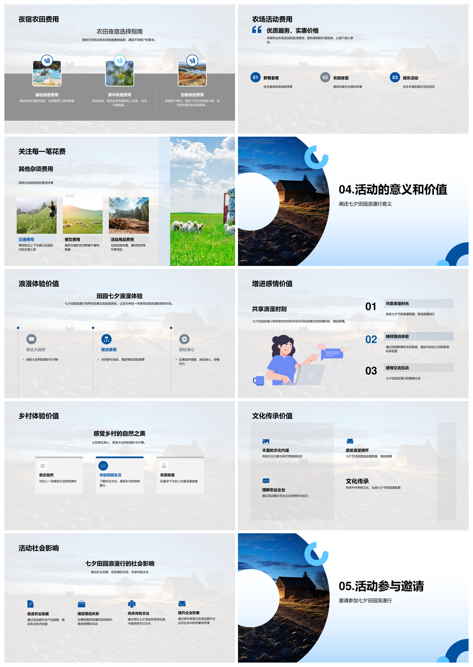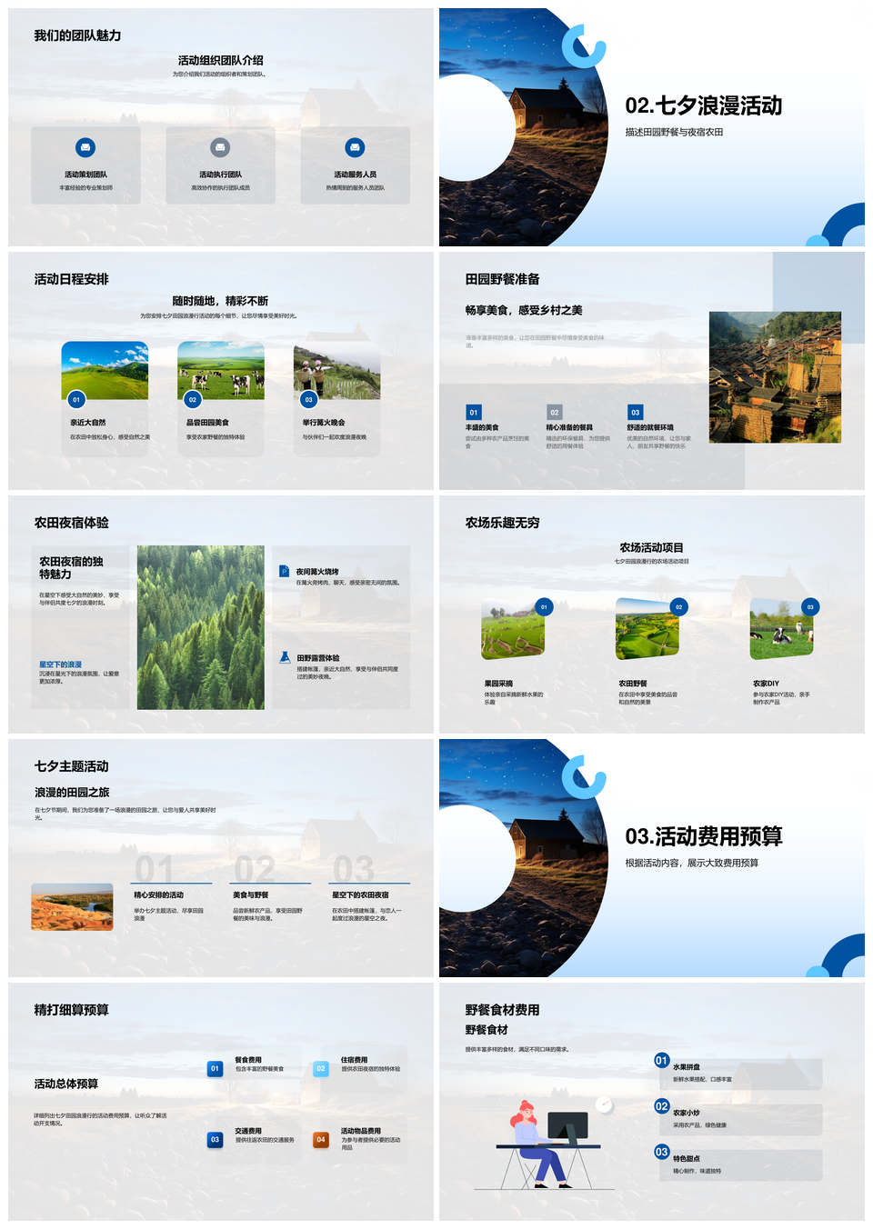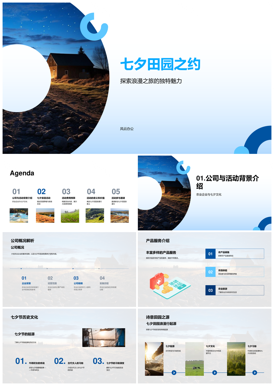 风云办公提供的七夕农业企业田园农场夜宿野餐PPT模板,下载格式为pptx,一共33页,作品中文字及图均可以修改和编辑,图片更改请在作品中右键图片并更换,文字修改请直接点击文字进行修改。