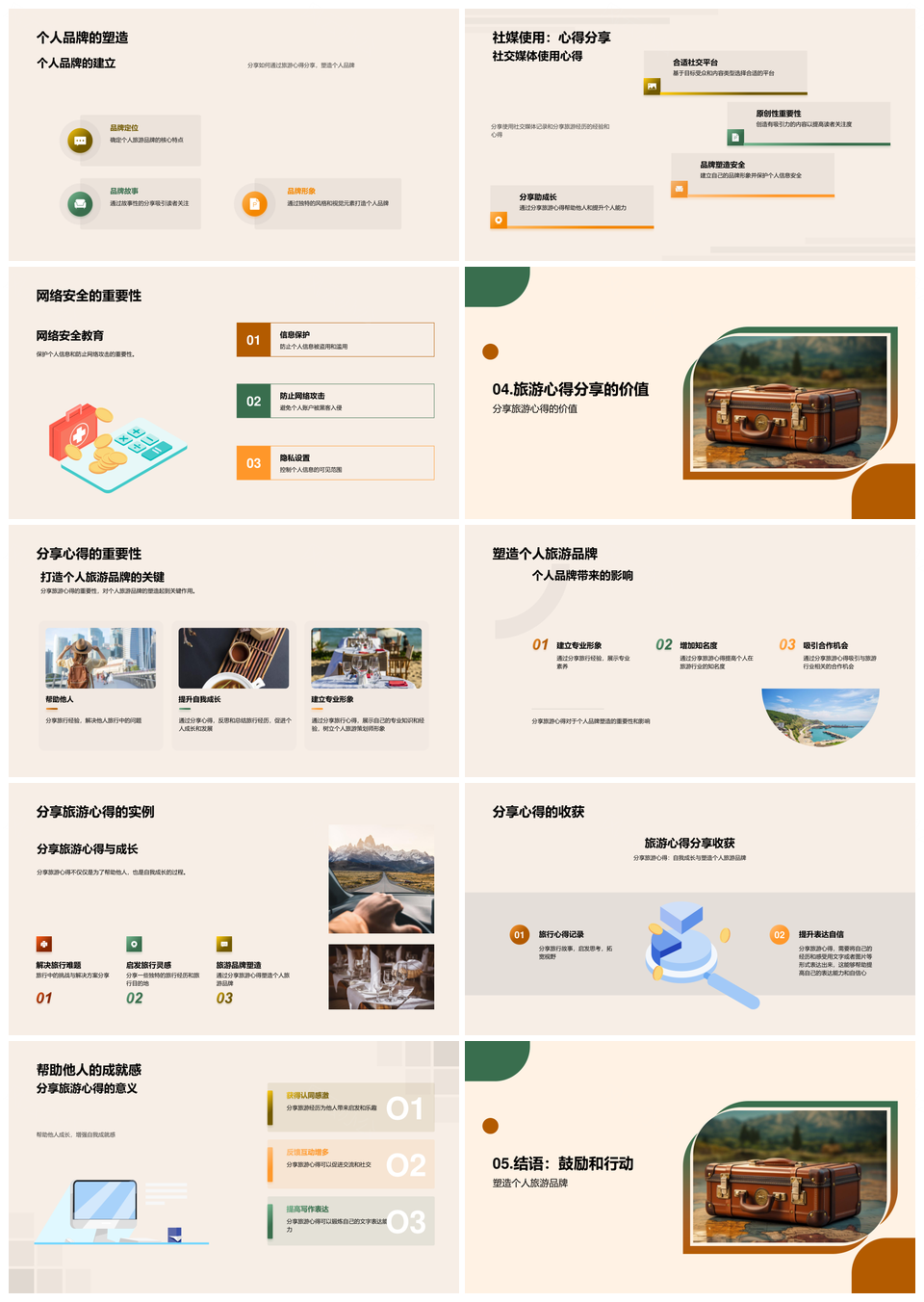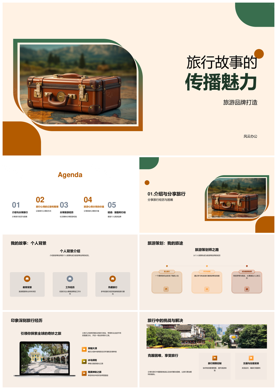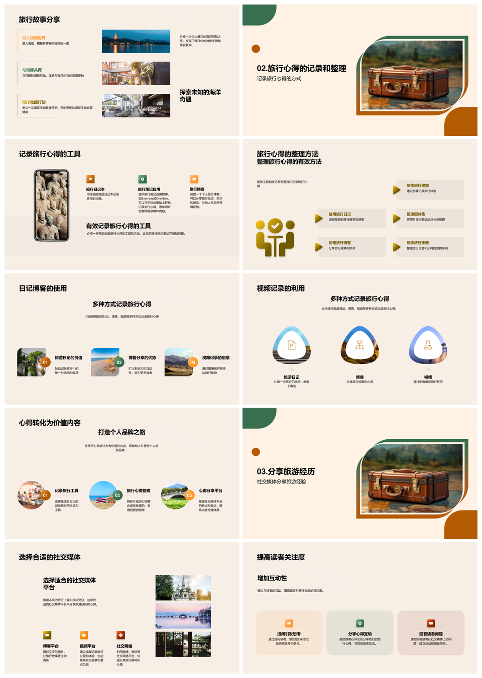 这是一张旅游品牌策划师博主复古手提箱社交媒体旅行故事PPT模板,包含旅游、品牌、策划师、博主、复古、手提箱、社交媒体、旅行、故事等主题内容,也可用作旅游品牌策划师博主、品牌策划师博主复古、策划师博主复古手提箱、博主复古手提箱社交媒体、复古手提箱社交媒体旅行、手提箱社交媒体旅行故事、复古手提箱社交媒体、社交媒体旅行故事、旅游品牌策划师、品牌策划师博主、策划师博主复古、博主复古手提箱、复古手提箱、社交媒体旅行、旅行故事等PPT场景使用。 风云办公提供的旅游品牌策划师博主复古手提箱社交媒体旅行故事PPT模板,下载格式为pptx,一共33页,作品中文字及图均可以修改和编辑,图片更改请在作品中右键图片并更换,文字修改请直接点击文字进行修改。