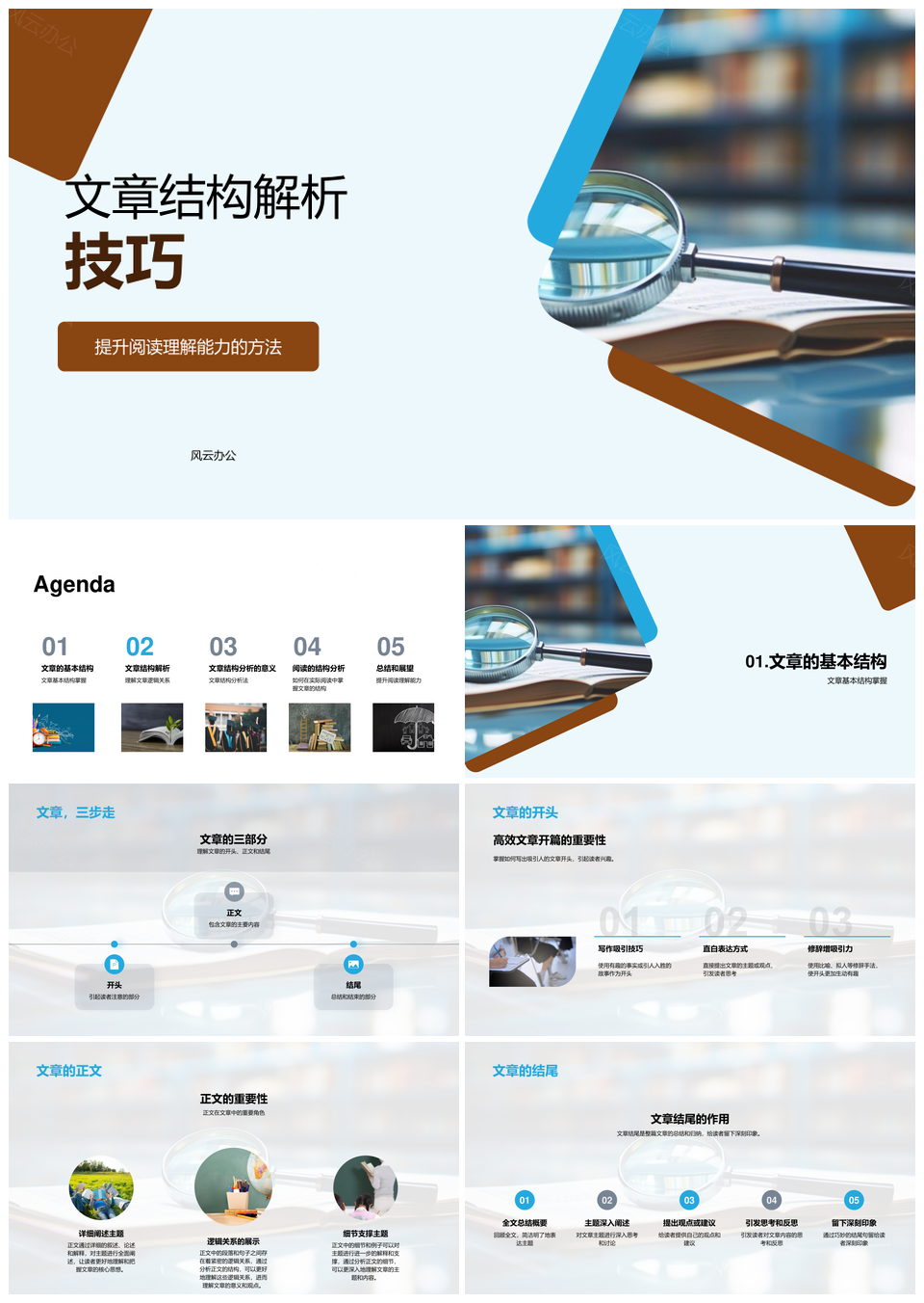 风云办公提供的文章结构解析与阅读理解能力提升PPT模板,下载格式为pptx,一共33页,作品中文字及图均可以修改和编辑,图片更改请在作品中右键图片并更换,文字修改请直接点击文字进行修改。