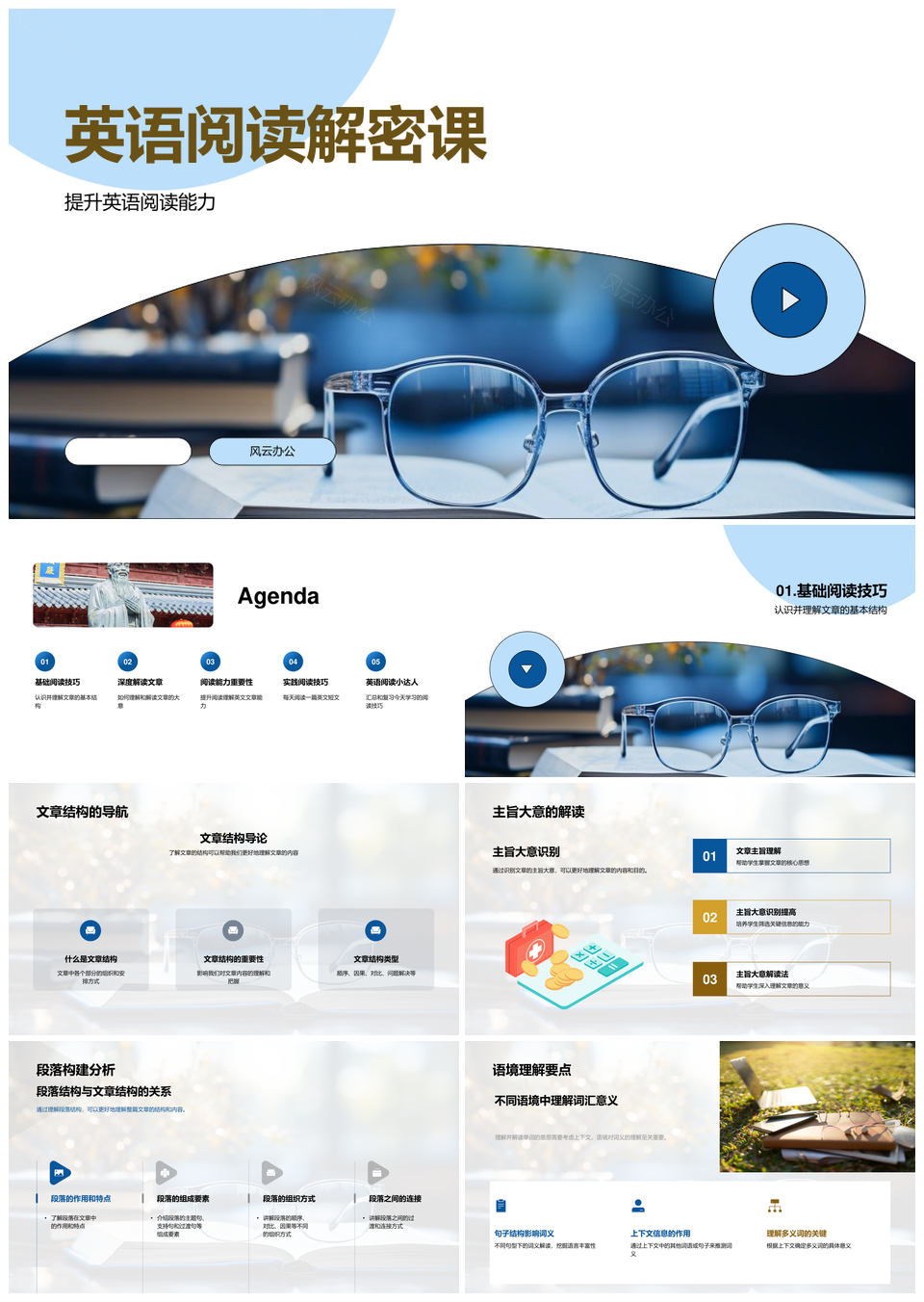 风云办公提供的英语阅读结构主旨解密提升能力PPT模板,下载格式为pptx,一共33页,作品中文字及图均可以修改和编辑,图片更改请在作品中右键图片并更换,文字修改请直接点击文字进行修改。