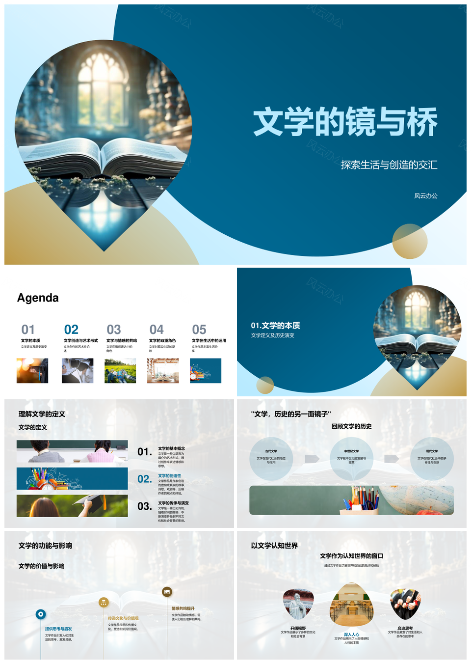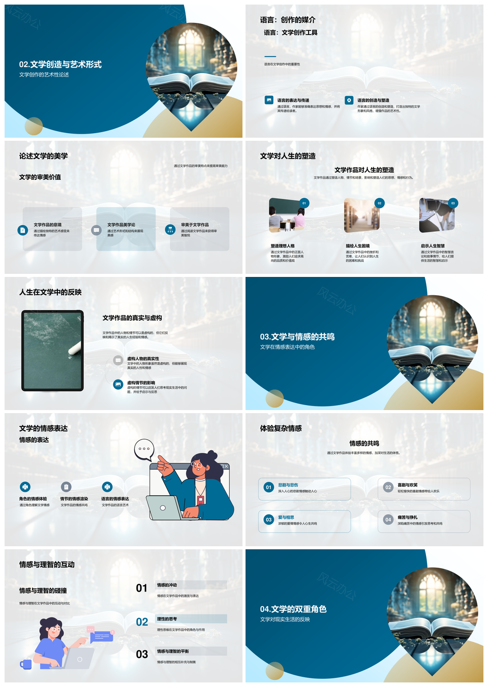 风云办公提供的文学艺术语言映生活情感创造演变史PPT模板,下载格式为pptx,一共25页,作品中文字及图均可以修改和编辑,图片更改请在作品中右键图片并更换,文字修改请直接点击文字进行修改。