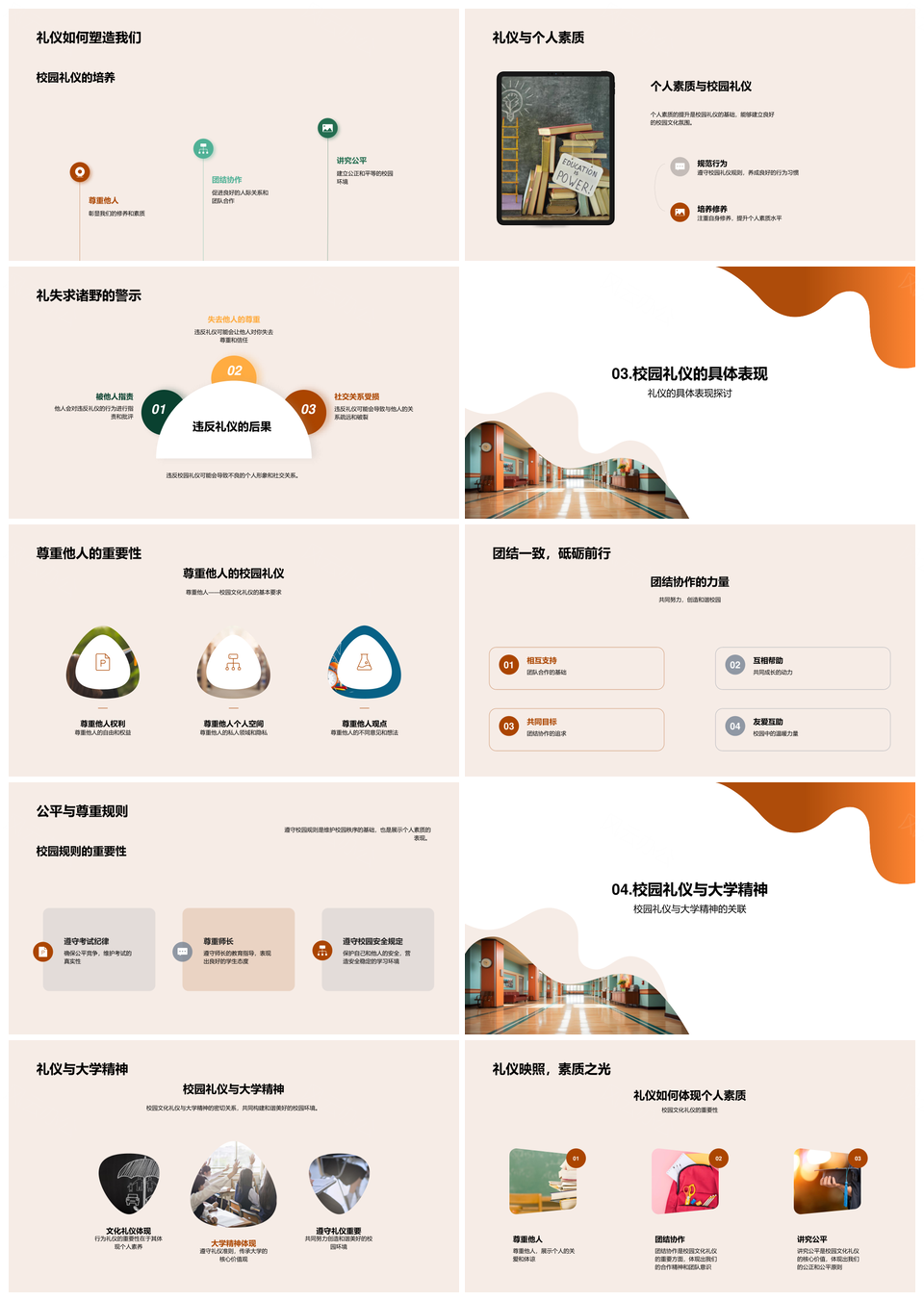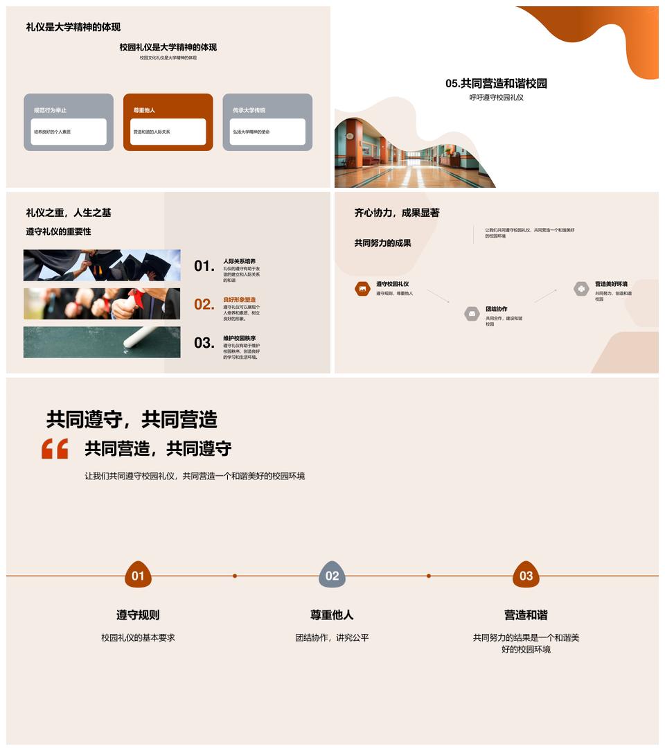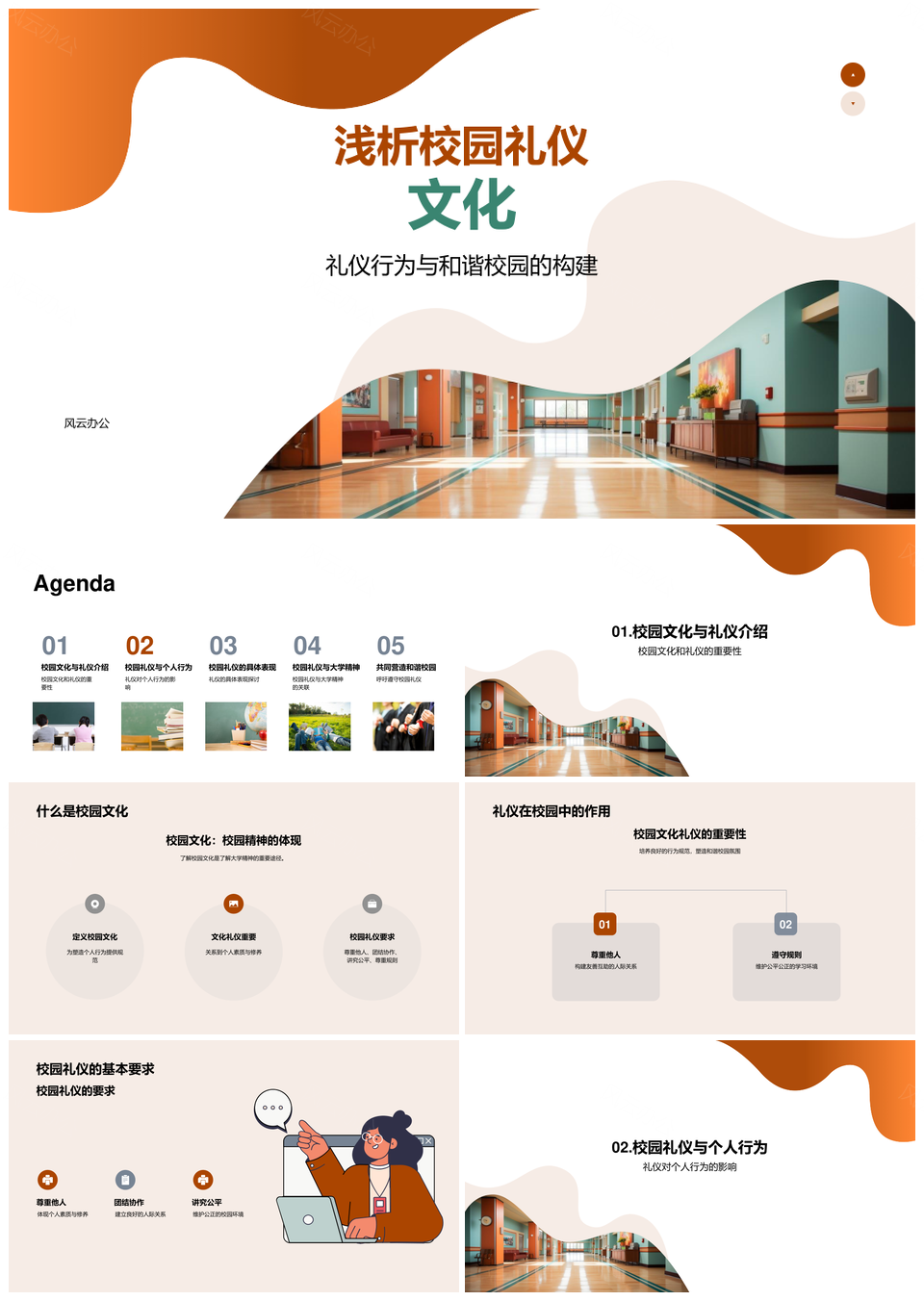 风云办公提供的校园礼仪与大学精神共建和谐校园文化PPT模板,下载格式为pptx,一共23页,作品中文字及图均可以修改和编辑,图片更改请在作品中右键图片并更换,文字修改请直接点击文字进行修改。