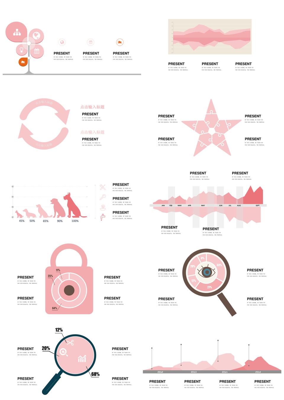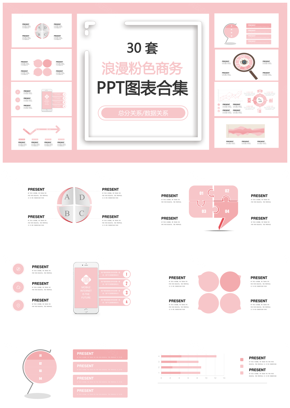 风云办公提供的浪漫粉色商务总分关系数据关系PPT图表合集,下载格式为pptx,一共31页,作品中文字及图均可以修改和编辑,图片更改请在作品中右键图片并更换,文字修改请直接点击文字进行修改。