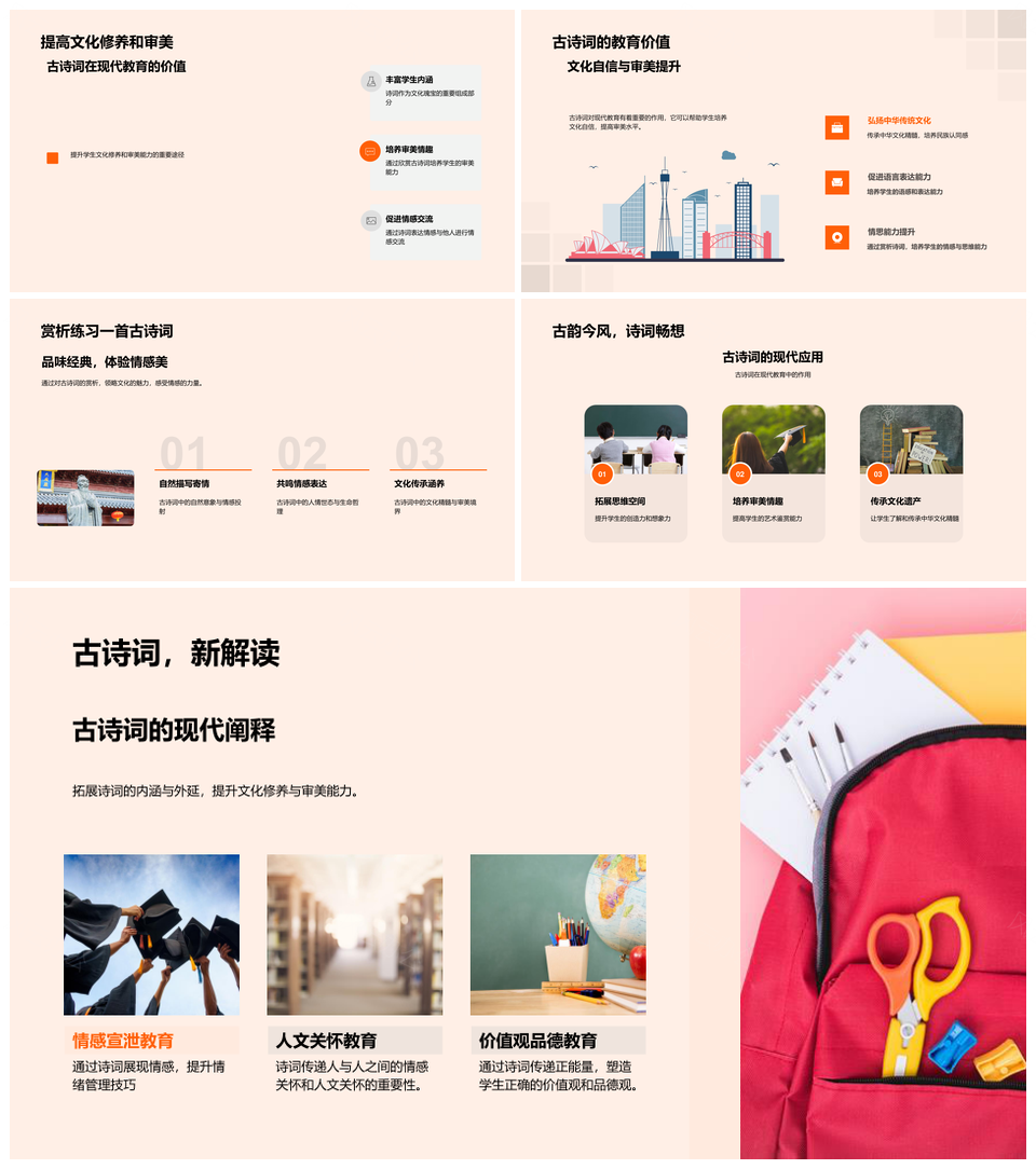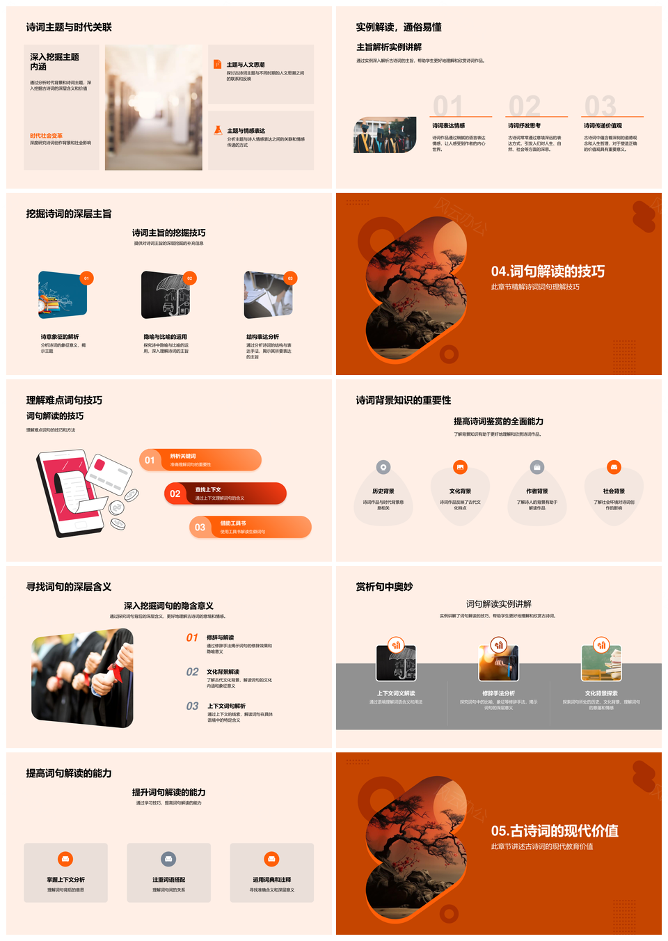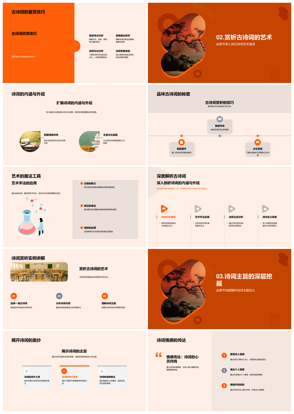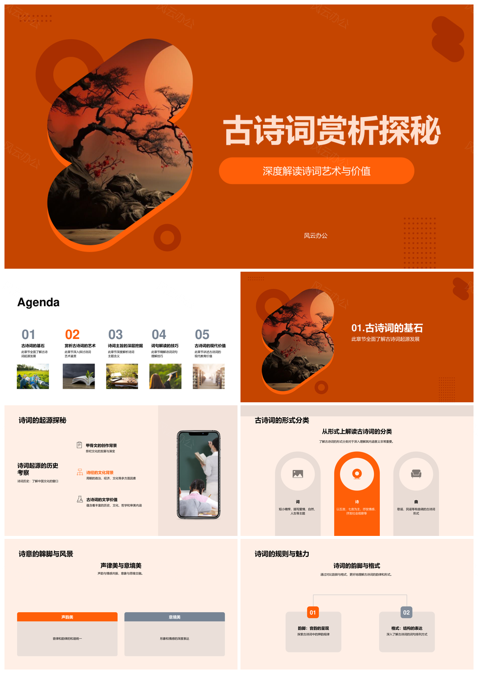 风云办公提供的古诗词艺术赏析探源声律意境美技巧PPT模板,下载格式为pptx,一共33页,作品中文字及图均可以修改和编辑,图片更改请在作品中右键图片并更换,文字修改请直接点击文字进行修改。