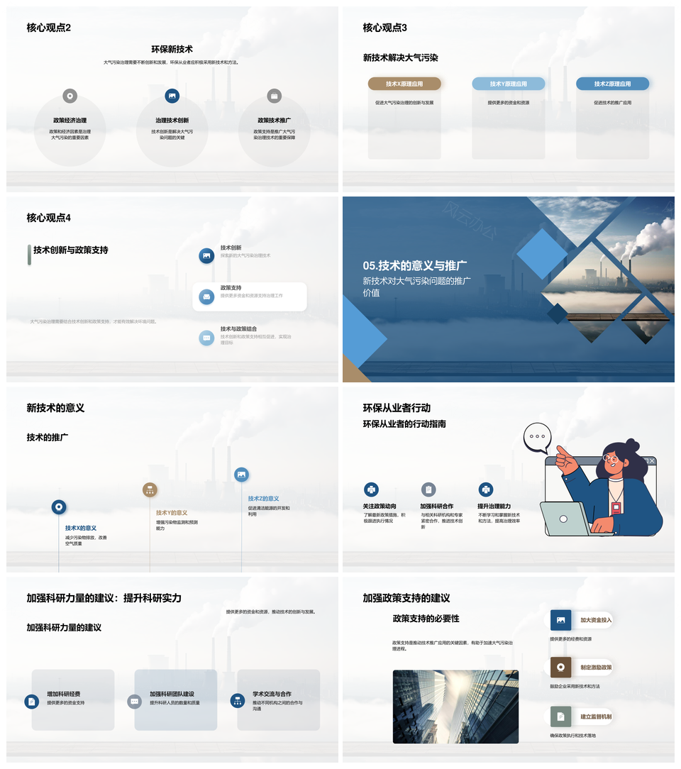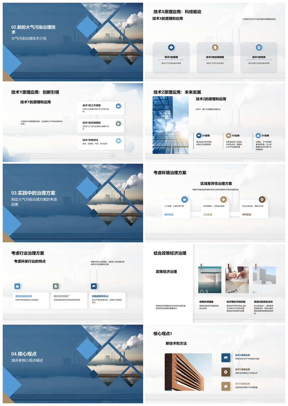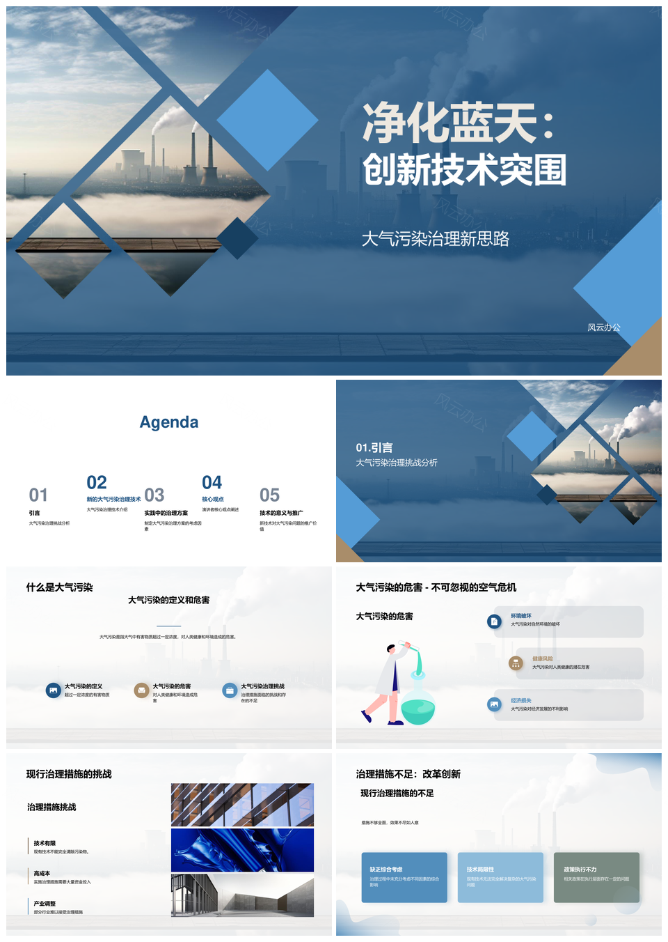 风云办公提供的科技治污创新攻坚蓝天保卫战PPT模板,下载格式为pptx,一共26页,作品中文字及图均可以修改和编辑,图片更改请在作品中右键图片并更换,文字修改请直接点击文字进行修改。
