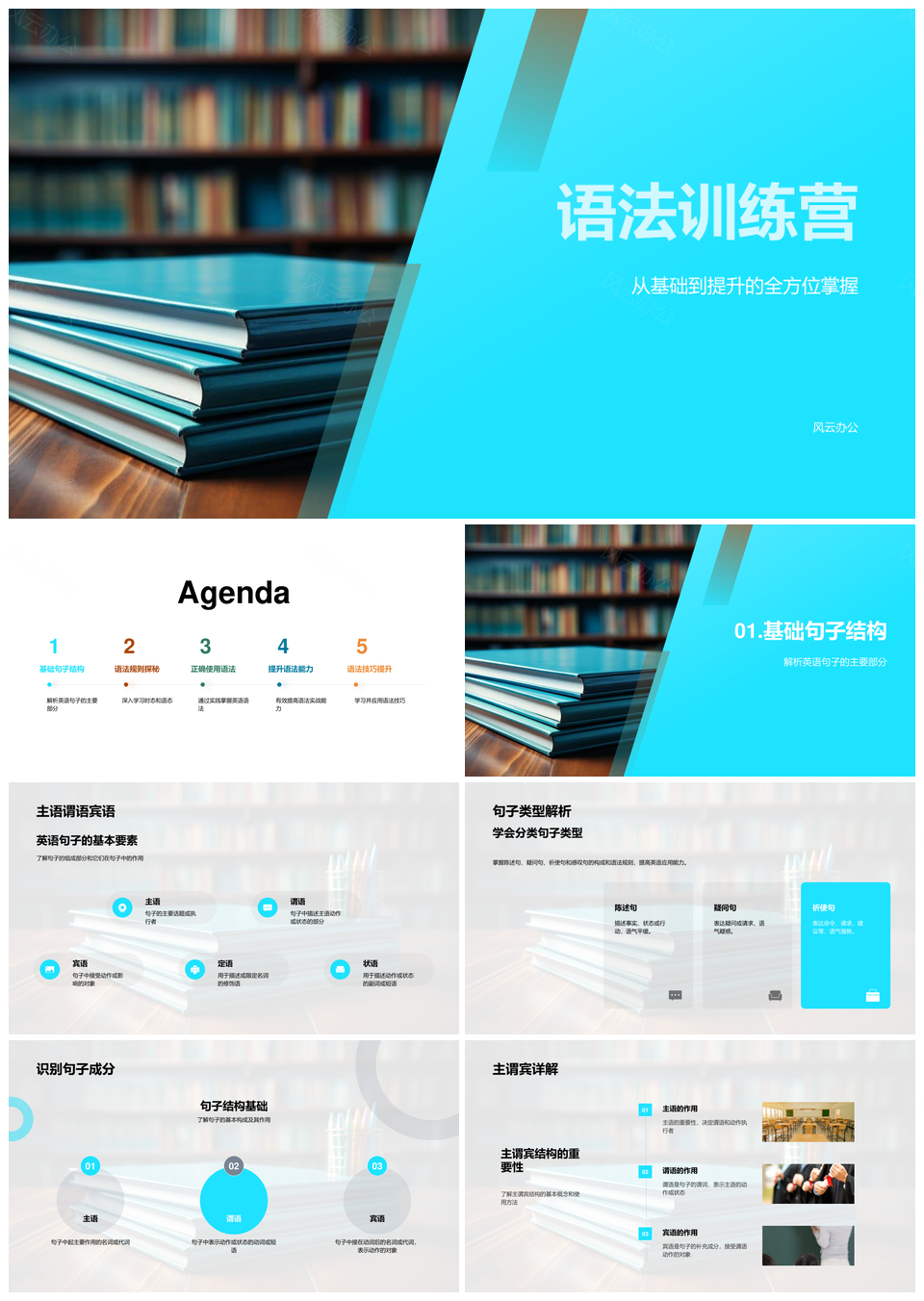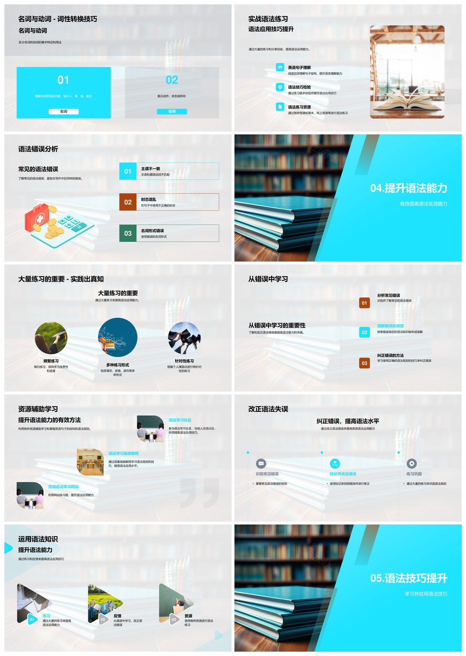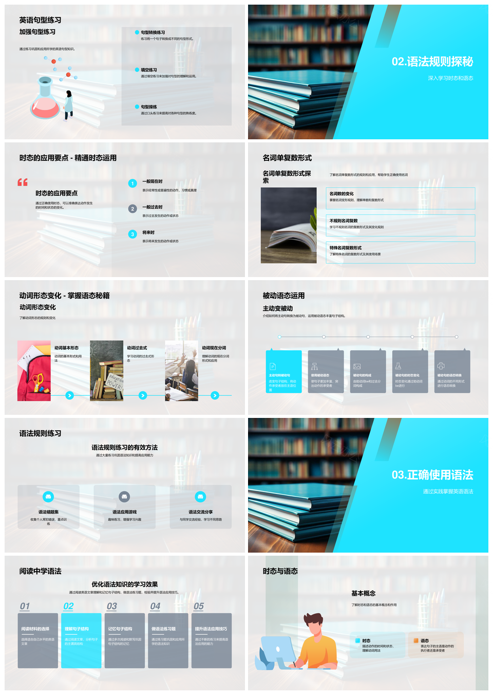 这是一张语法训练营名词单复数动词变形语态提升PPT模板,包含语法训练营、名词、单复数、动词变形、语态提升等主题内容,也可用作语法训练营名词单复数、训练营名词单复数动词、名词单复数动词变形、单复数动词变形语态、动词变形语态提升、语法训练营动词变形、训练营动词变形语态、语法训练营名词、训练营名词单复数、名词单复数动词、单复数动词变形、动词变形语态、变形语态提升、语法训练营、名词单复数、动词变形等PPT场景使用。 风云办公提供的语法训练营名词单复数动词变形语态提升PPT模板,下载格式为pptx,一共33页,作品中文字及图均可以修改和编辑,图片更改请在作品中右键图片并更换,文字修改请直接点击文字进行修改。