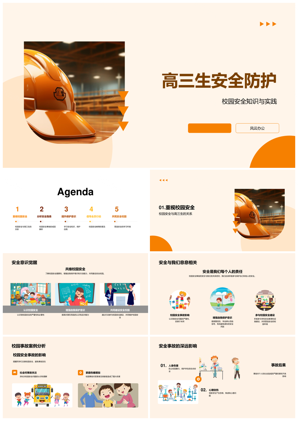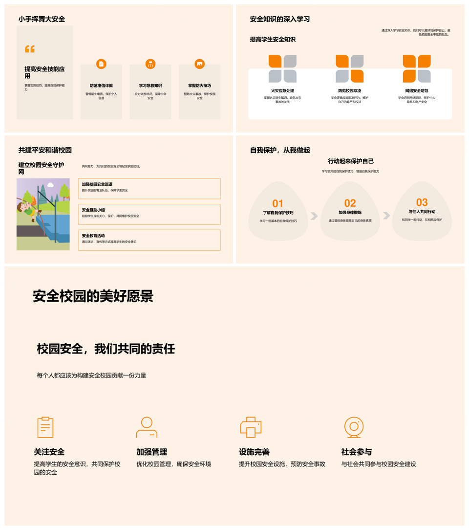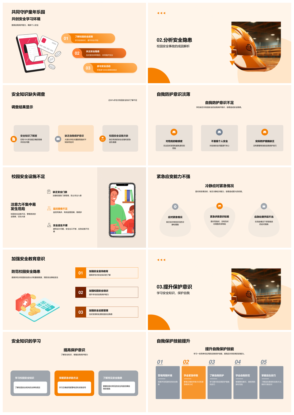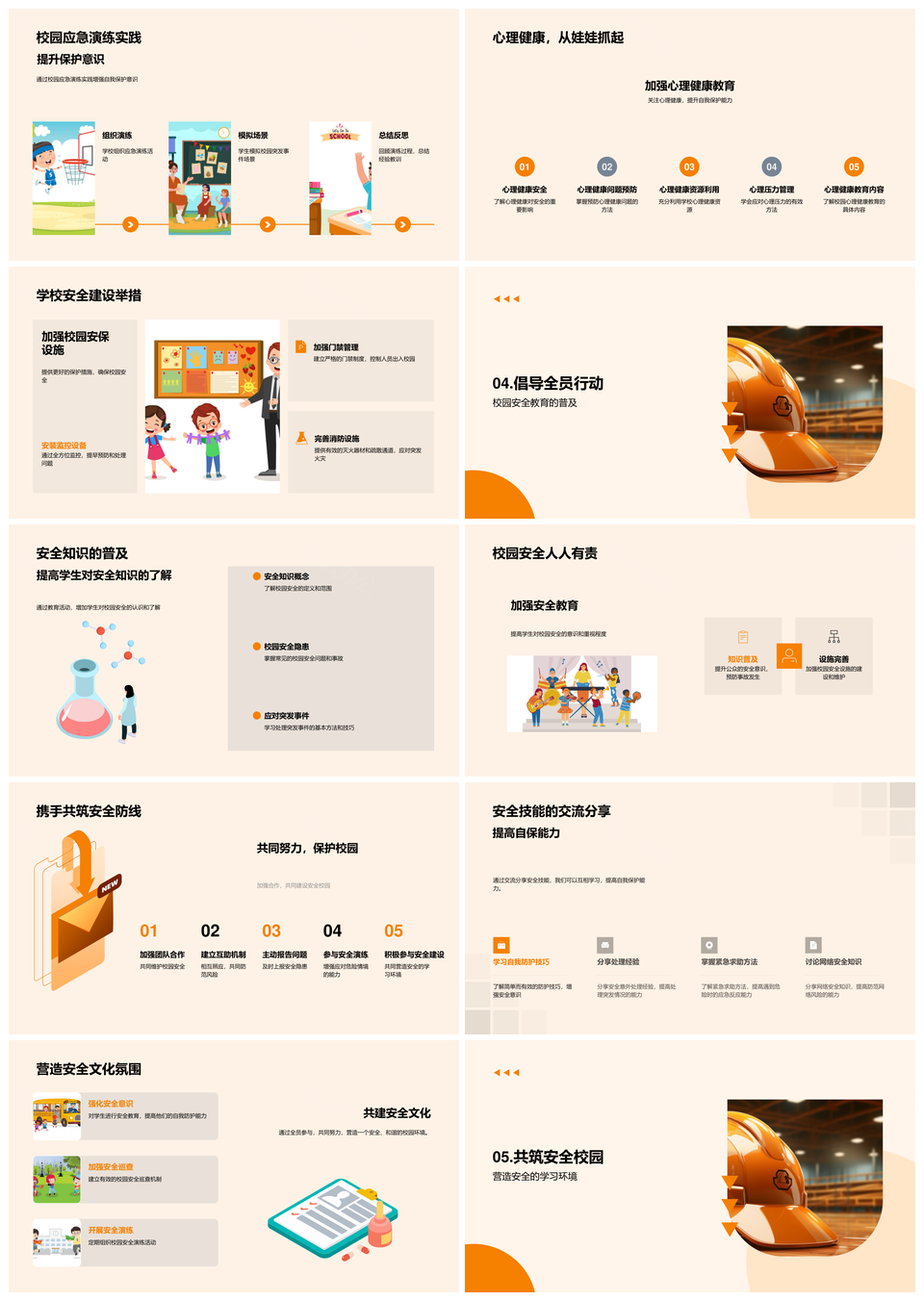 这款PPT模板以明快橙色为主视觉,巧妙融合安全帽等校园防护符号,专注呈现安全教育场景的专业性与实用性。内容框架覆盖应急管理、心理教育、个人防护三大模块,逻辑清晰易操作,方便教师快速搭建课程结构。设计上加入波粒二象性抽象纹理与激光线条元素,隐喻光速响应的应急机制与多维度防护思维,示意图表兼容理论解析与实操指引,适配培训课件、预案推演等场景。模版文本预留科学数据接口,支持插入校园安全指标参数,版面信息层级经过人因工程验证,确保学术汇报的专业调性。