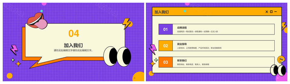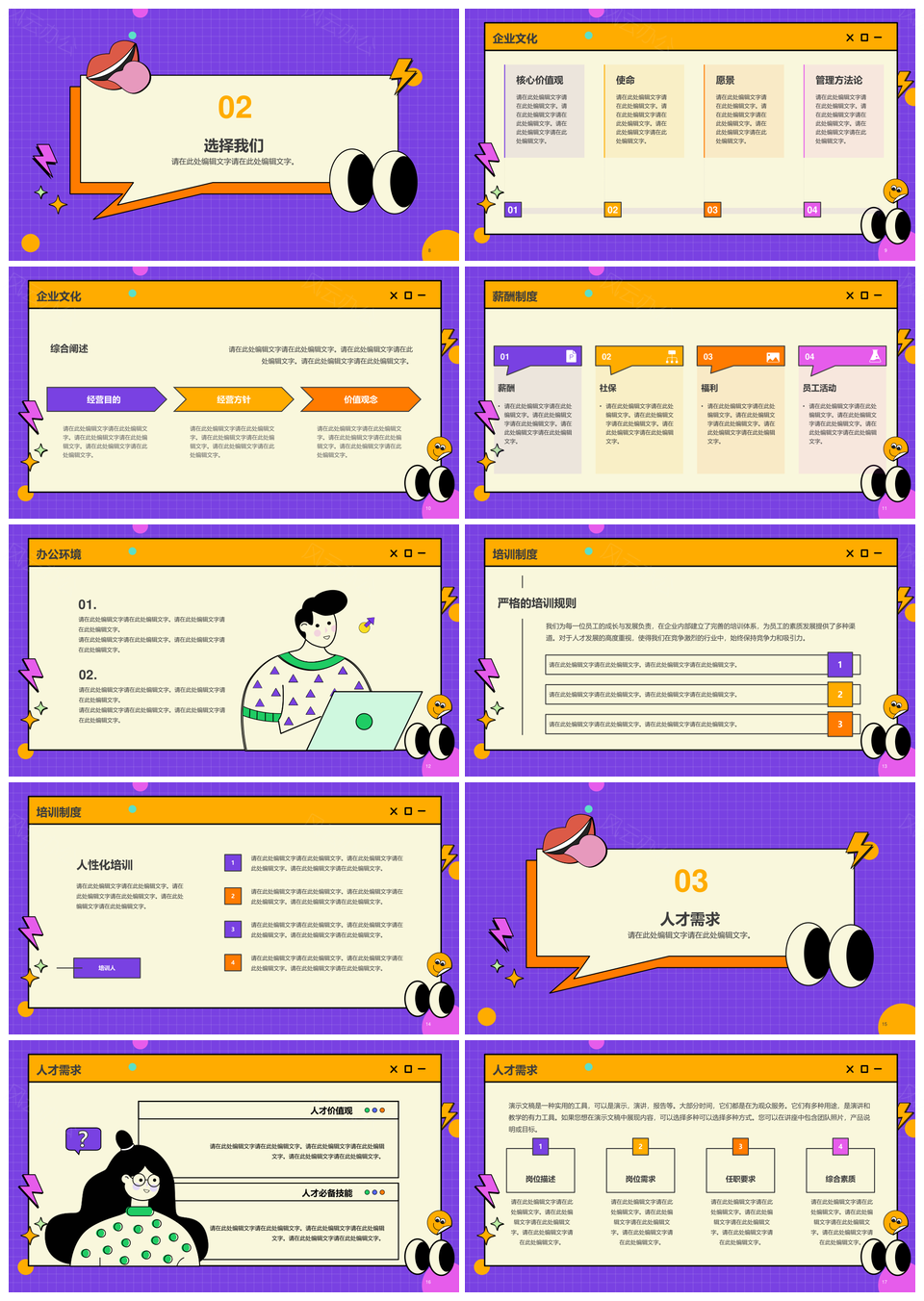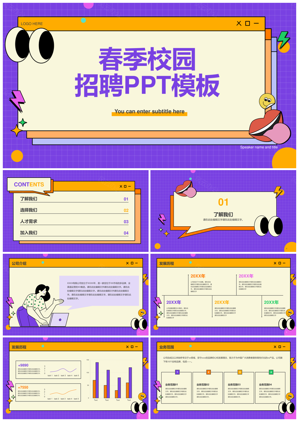 风云办公提供的紫色高饱和孟菲斯春招校招宣讲会PPT模板,下载格式为pptx,一共20页,作品中文字及图均可以修改和编辑,图片更改请在作品中右键图片并更换,文字修改请直接点击文字进行修改。
