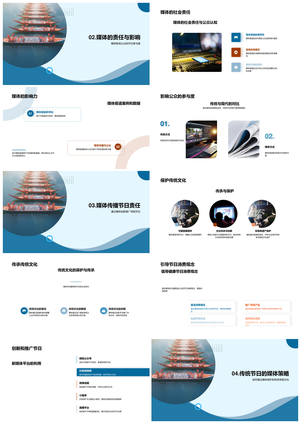 这是一张媒体传播策略与端午节龙舟传统文化公众认知PPT模板,包含媒体、传播、策略、端午节、龙舟、传统文化、公众、认知等主题内容,也可用作媒体传播策略与端午节龙舟传统文化公众认知、媒体传播策略端午节龙舟、端午节龙舟传统文化公众、龙舟传统文化公众认知、媒体传播策略端午节、端午节龙舟传统文化、媒体传播端午节龙舟、传统文化公众认知、龙舟传统文化公众、媒体传播策略、公众认知端午节、传播策略龙舟、端午节龙舟公众、传统文化认知、龙舟公众认知等PPT场景使用。 风云办公提供的媒体传播策略与端午节龙舟传统文化公众认知PPT模板,下载格式为pptx,一共27页,作品中文字及图均可以修改和编辑,图片更改请在作品中右键图片并更换,文字修改请直接点击文字进行修改。