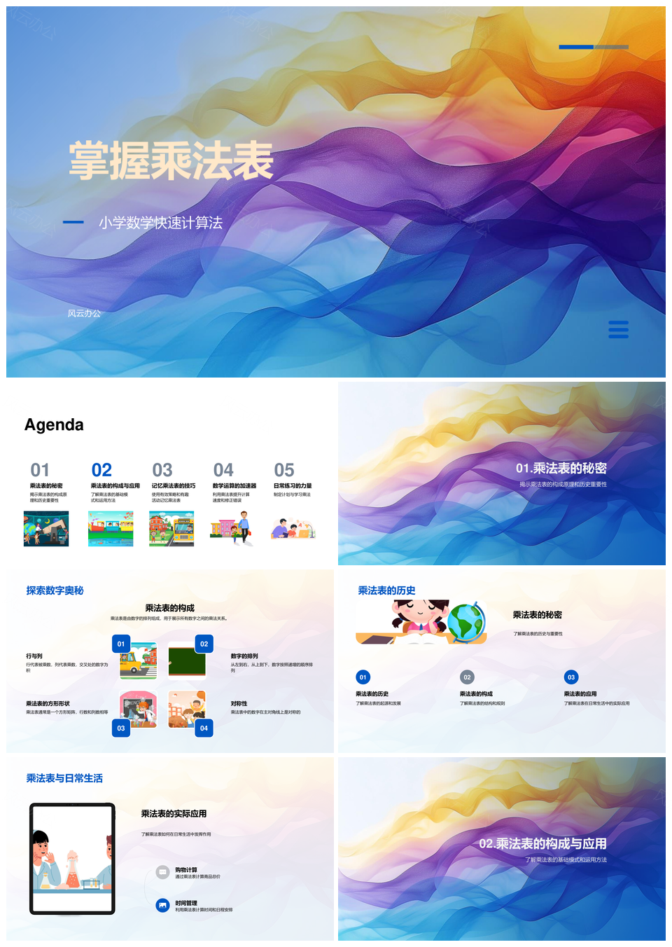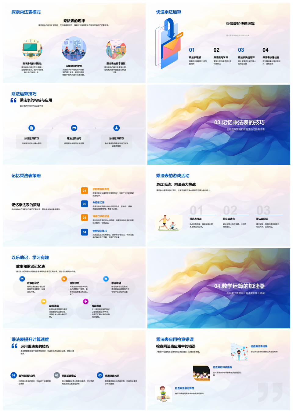 风云办公提供的小学乘法表快速运算教学课件基础模式PPT模板,下载格式为pptx,一共23页,作品中文字及图均可以修改和编辑,图片更改请在作品中右键图片并更换,文字修改请直接点击文字进行修改。