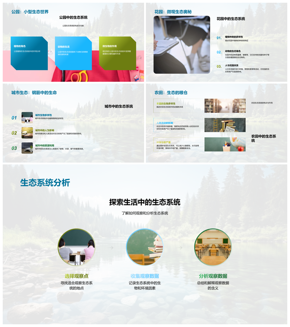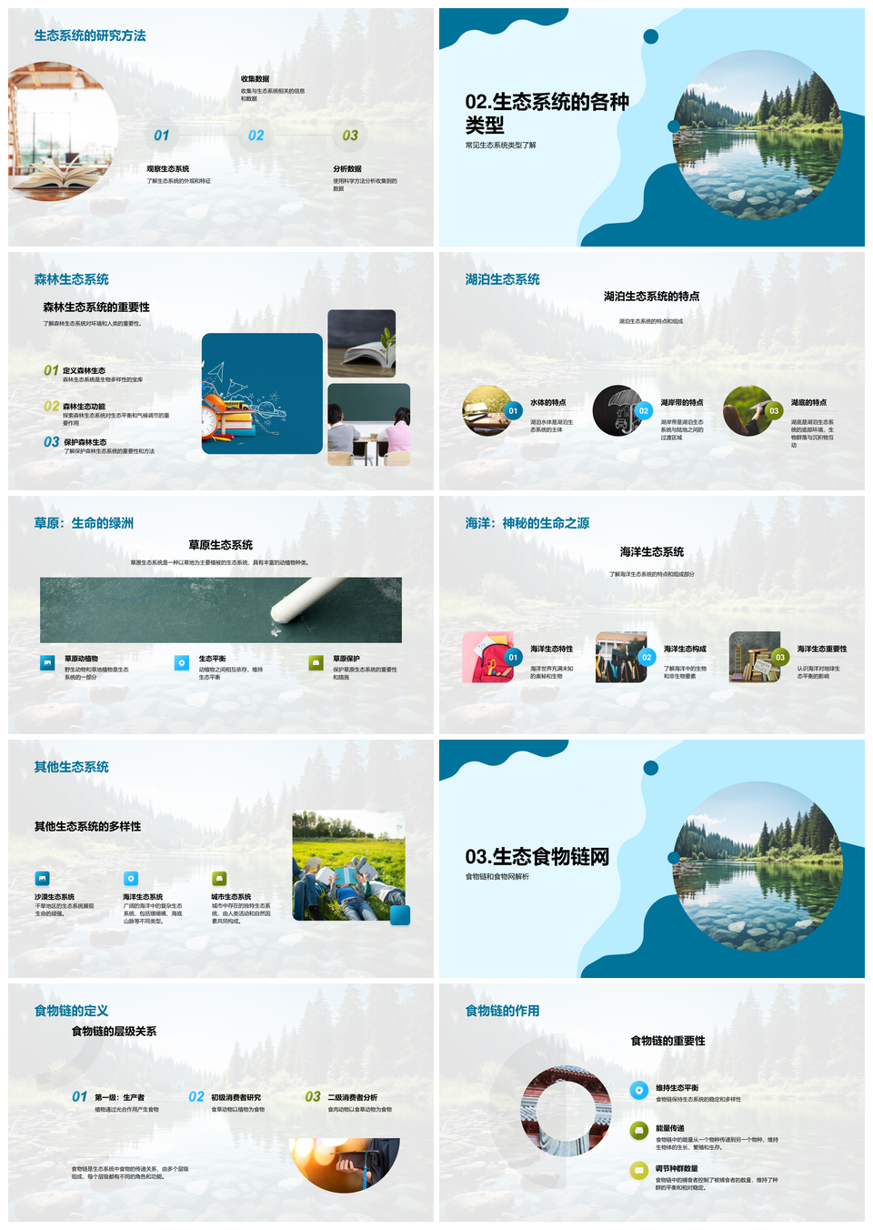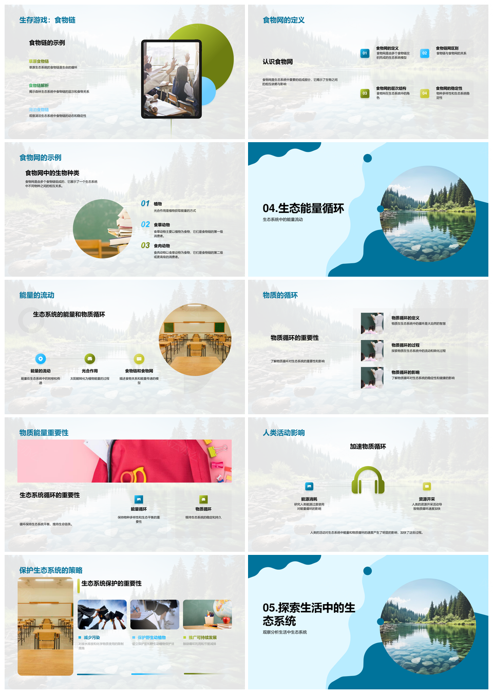 这是一张森林湖泊草原生态系统食物链网能量物质循环PPT模板,包含森林、湖泊、草原、生态系统、食物链、网、能量、物质、循环等主题内容,也可用作森林湖泊草原生态系统、湖泊草原生态系统食物链网、草原生态系统食物链网能量、生态系统食物链网能量物质循环、森林湖泊生态系统物质循环、湖泊草原食物链网物质循环、草原食物链网能量物质循环、森林生态系统能量物质循环、森林草原能量物质循环、湖泊生态系统能量物质循环、生态系统食物链网物质循环、森林湖泊草原食物链网、草原能量物质循环、湖泊食物链网能量、森林生态系统物质循环等PPT场景使用。 风云办公提供的森林湖泊草原生态系统食物链网能量物质循环PPT模板,下载格式为pptx,一共33页,作品中文字及图均可以修改和编辑,图片更改请在作品中右键图片并更换,文字修改请直接点击文字进行修改。