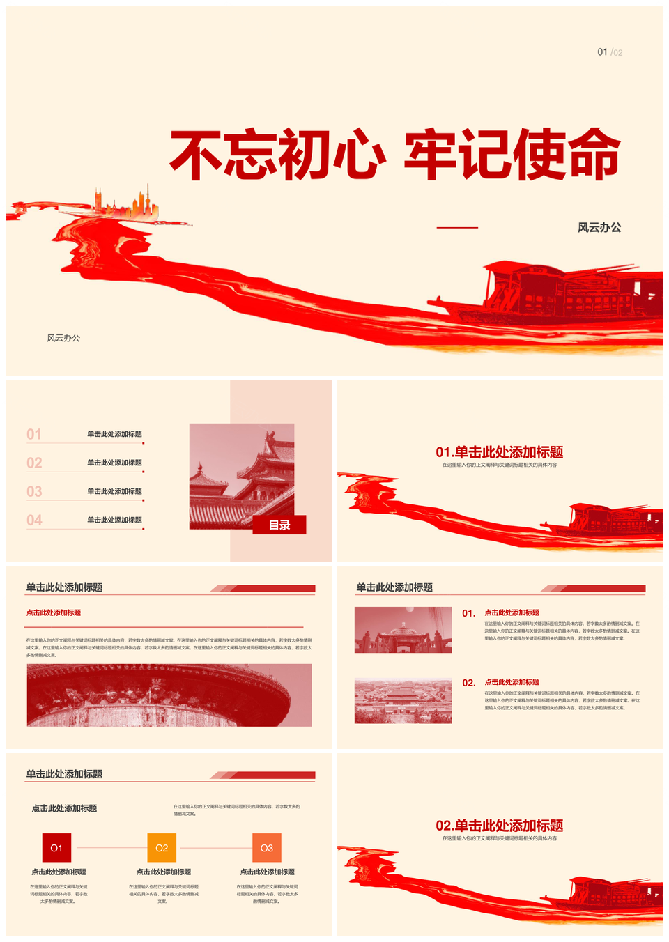 这是一张红黄简约渐变不忘初心牢记使命红船庆典PPT模板,包含红黄、简约、渐变、不忘初心、牢记使命、红船、庆典等主题内容,也可用作不忘初心牢记使命红船庆典、红黄简约渐变不忘初心、简约渐变不忘初心牢记使命、红黄简约渐变红船、红黄简约渐变、简约渐变红船、简约渐变不忘初心、简约渐变牢记使命、不忘初心牢记使命红船、牢记使命红船庆典、红船庆典、不忘初心牢记使命、红黄简约、红黄渐变、简约渐变等PPT场景使用。 风云办公提供的红黄简约渐变不忘初心牢记使命红船庆典PPT模板,下载格式为pptx,一共20页,作品中文字及图均可以修改和编辑,图片更改请在作品中右键图片并更换,文字修改请直接点击文字进行修改。
