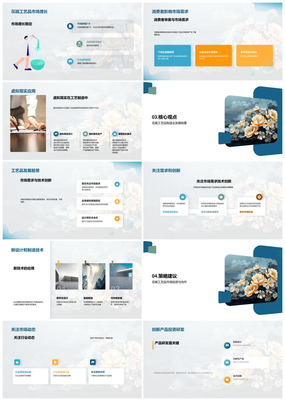这是一张花画工艺品制造业趋势与艺术设计市场前景PPT模板,包含花画、工艺品、制造业、趋势、艺术、设计、市场、前景等主题内容,也可用作花画工艺品制造业趋势艺术设计、花画工艺品制造业趋势、工艺品制造业趋势艺术设计、制造业趋势艺术设计市场前景、花画工艺品制造业、工艺品制造业趋势、制造业趋势艺术设计、艺术设计市场前景、花画工艺品、工艺品制造业、制造业趋势、趋势艺术设计、艺术设计市场前景、花画艺术设计、工艺品艺术设计等PPT场景使用。 风云办公提供的花画工艺品制造业趋势与艺术设计市场前景PPT模板,下载格式为pptx,一共19页,作品中文字及图均可以修改和编辑,图片更改请在作品中右键图片并更换,文字修改请直接点击文字进行修改。