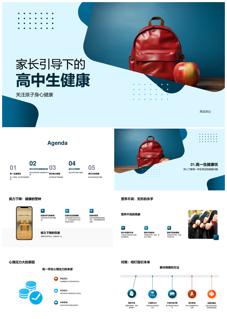 风云办公提供的家长引导高中生健康视力营养心理教育PPT模板,下载格式为pptx,一共28页,作品中文字及图均可以修改和编辑,图片更改请在作品中右键图片并更换,文字修改请直接点击文字进行修改。