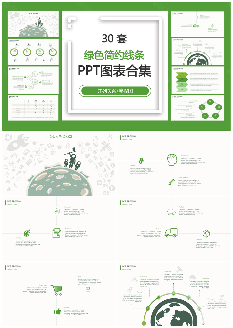这是一张绿色简约线条并列关系流程图PPT图表合集,包含绿色、简约、线条、并列关系、流程图、图表、合集等主题内容,也可用作绿色、简约、线条、并列关系、流程图、PPT、图表、合集