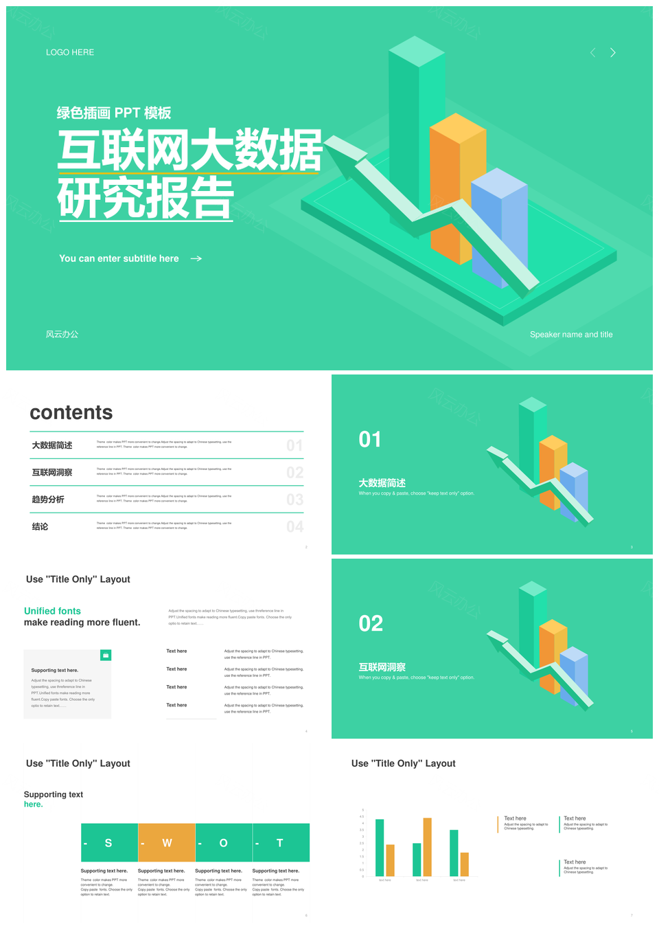 风云办公提供的绿色创意插画数据图表互联网研究报告PPT模板,下载格式为pptx,一共14页,作品中文字及图均可以修改和编辑,图片更改请在作品中右键图片并更换,文字修改请直接点击文字进行修改。