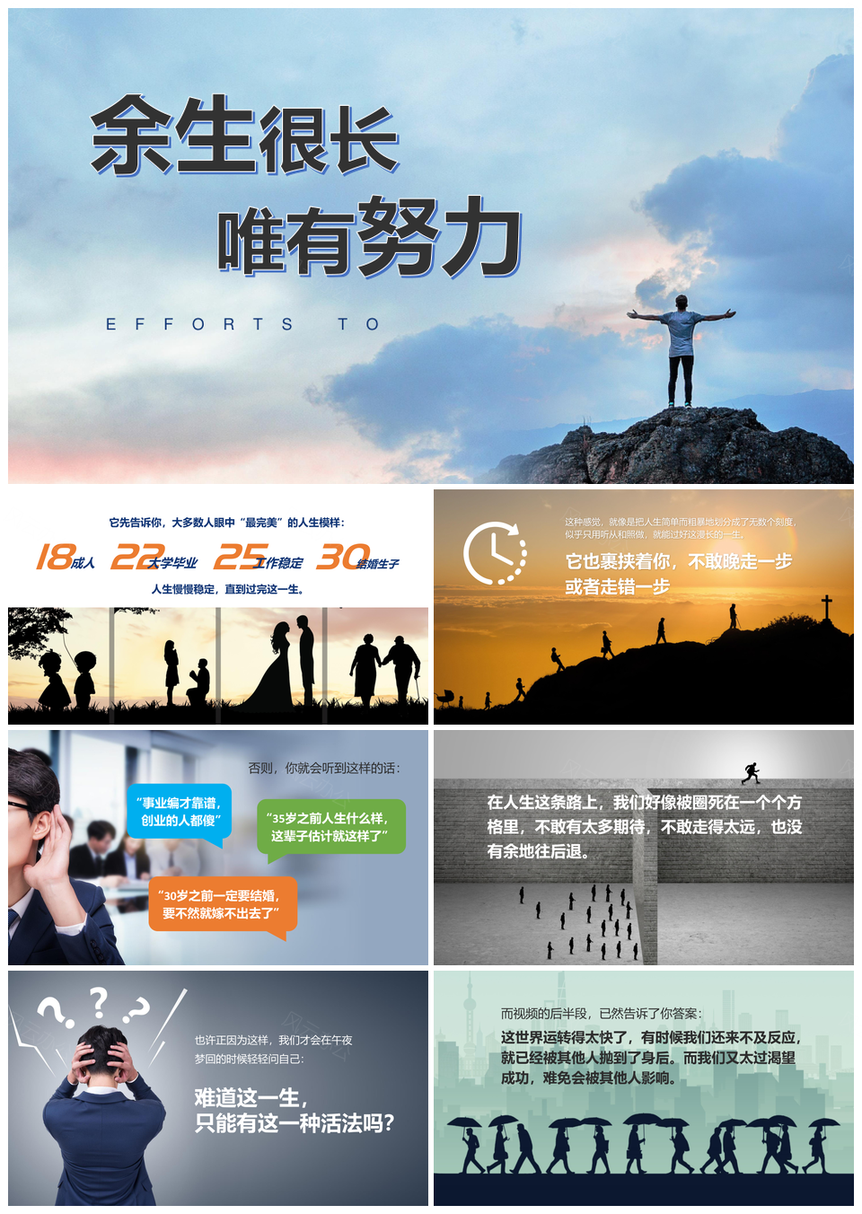 这是一张余生奋力勤勉励志向上PPT模板,包含奋力、勤勉、励志、向上等主题内容,也可用作余生奋力勤勉励志向上、余生奋力勤勉向上、余生勤勉励志向上、余生奋力励志向上、勤勉励志向上、余生奋力勤勉、余生勤勉励志、奋力勤勉向上、余生励志向上、奋力励志向上、勤勉向上、余生奋力向上、励志向上、余生勤勉、奋力勤勉等PPT场景使用。 风云办公提供的余生奋力勤勉励志向上PPT模板,下载格式为pptx,一共17页,作品中文字及图均可以修改和编辑,图片更改请在作品中右键图片并更换,文字修改请直接点击文字进行修改。