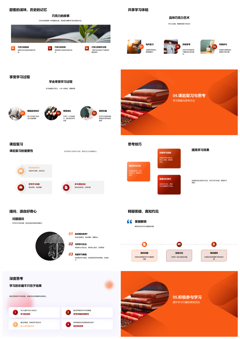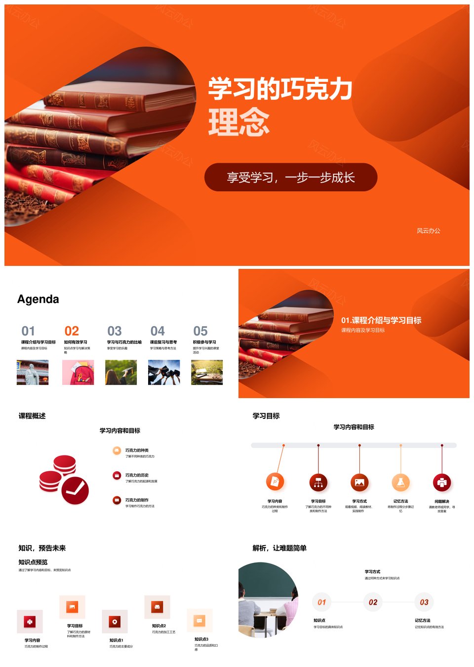 风云办公提供的巧克力学习法享受课堂考试步步成长PPT模板,下载格式为pptx,一共33页,作品中文字及图均可以修改和编辑,图片更改请在作品中右键图片并更换,文字修改请直接点击文字进行修改。