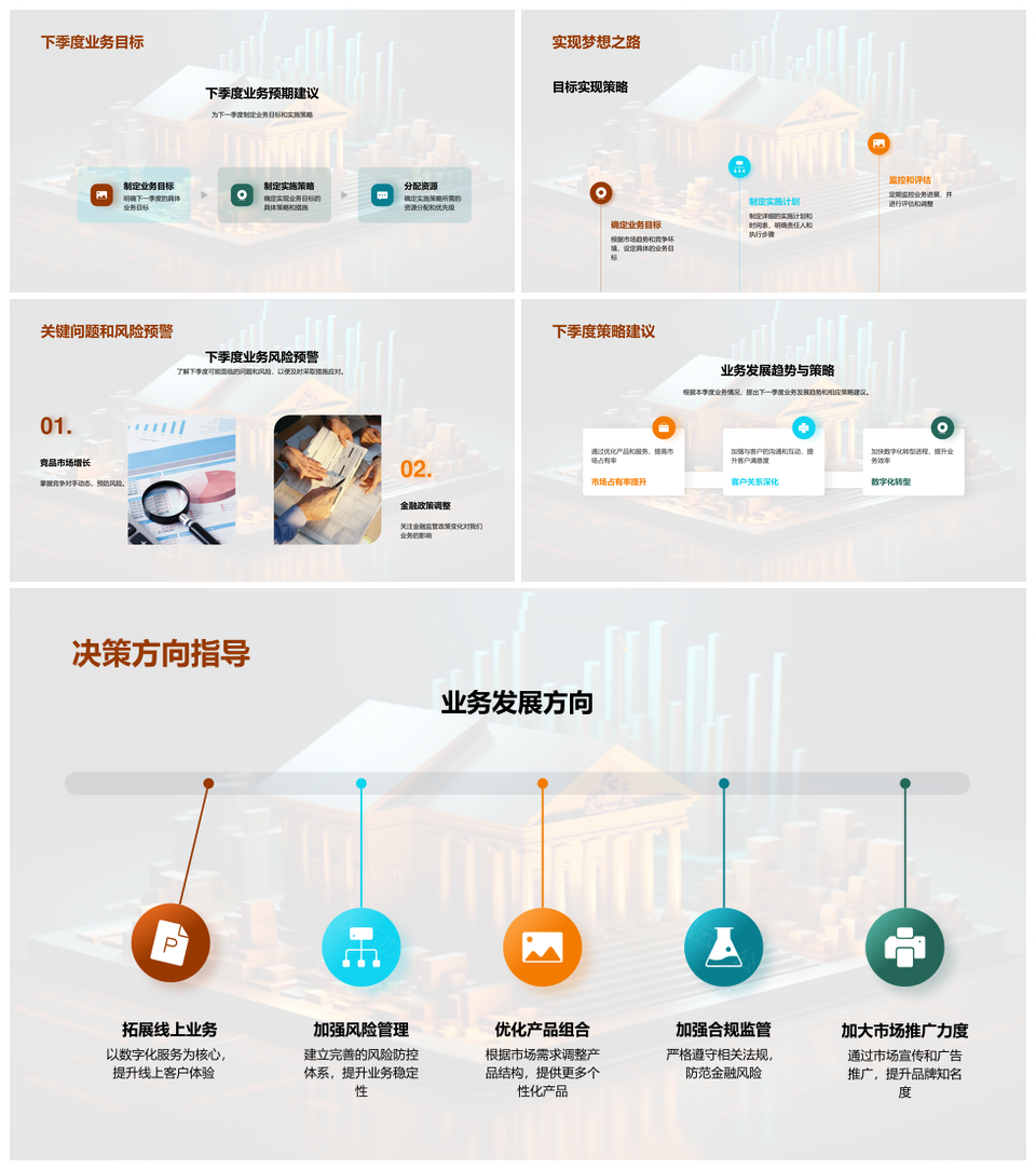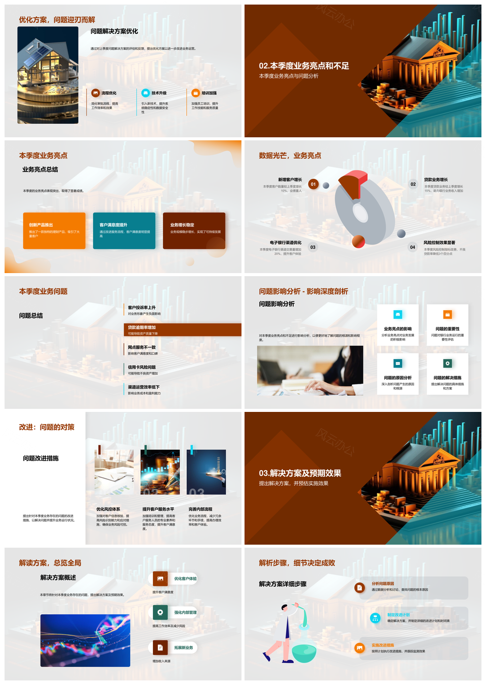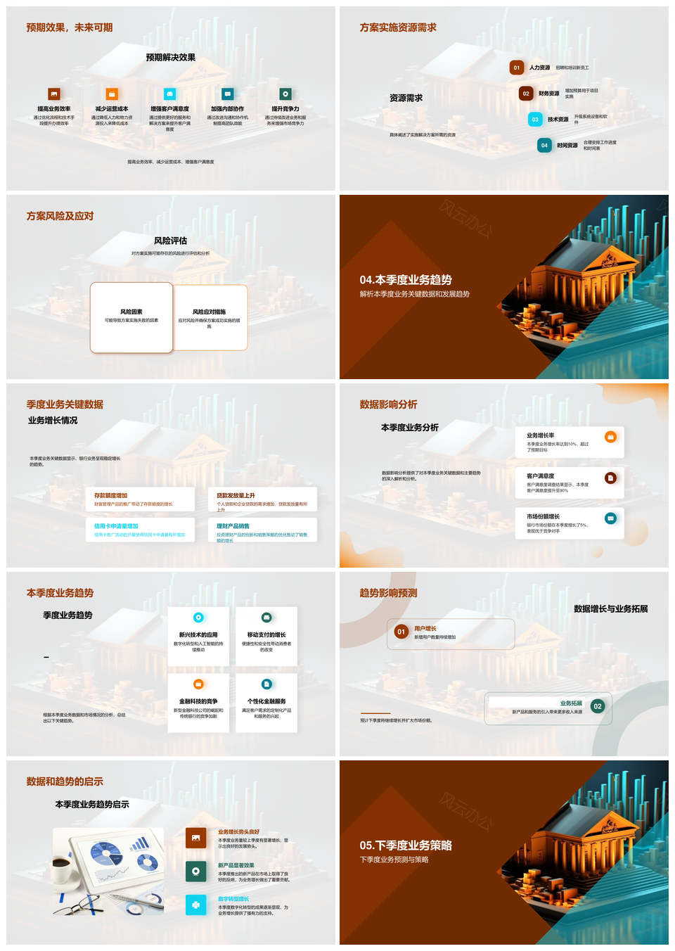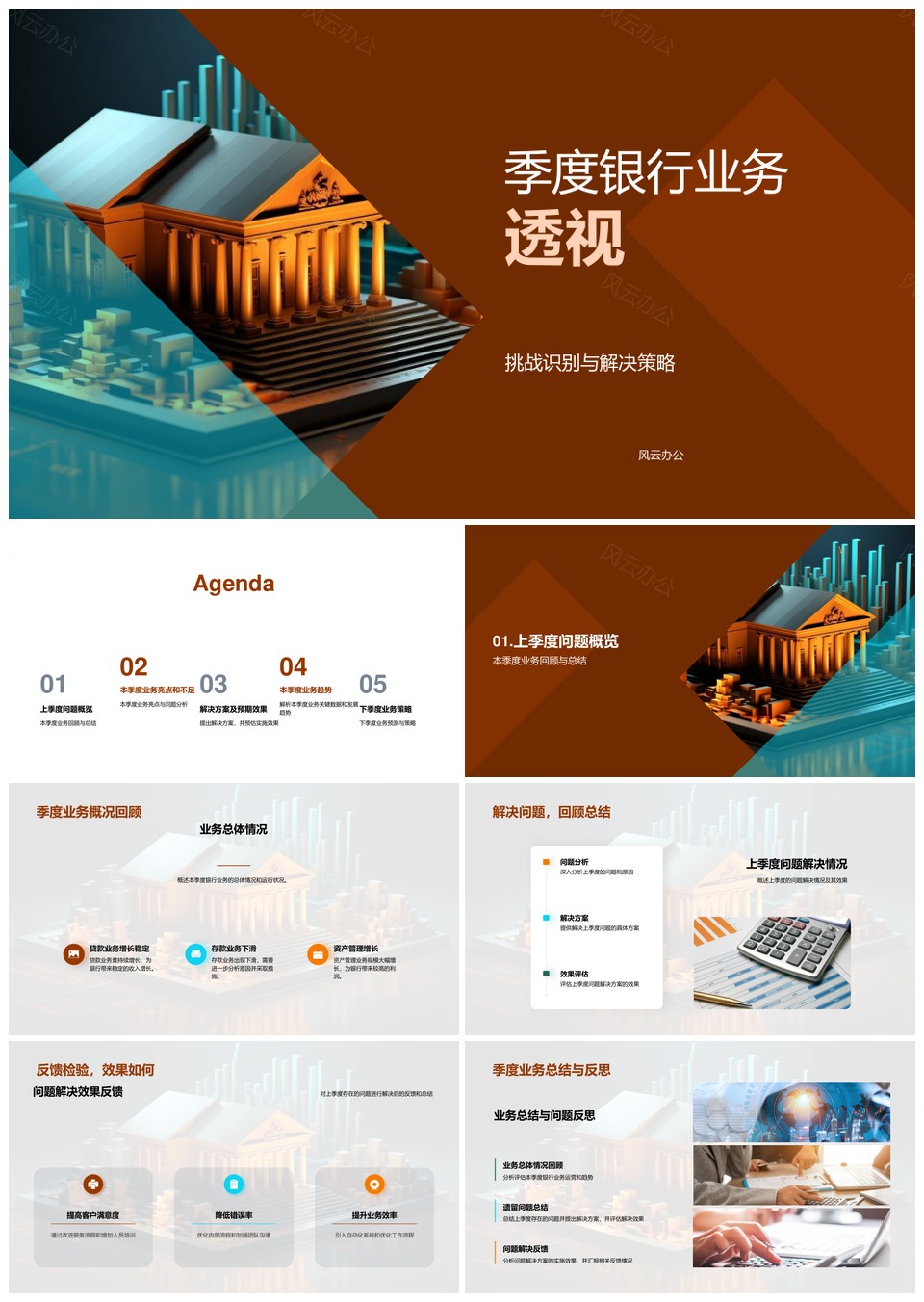 风云办公提供的银行业务季度总结亮点问题趋势策略PPT模板,下载格式为pptx,一共33页,作品中文字及图均可以修改和编辑,图片更改请在作品中右键图片并更换,文字修改请直接点击文字进行修改。