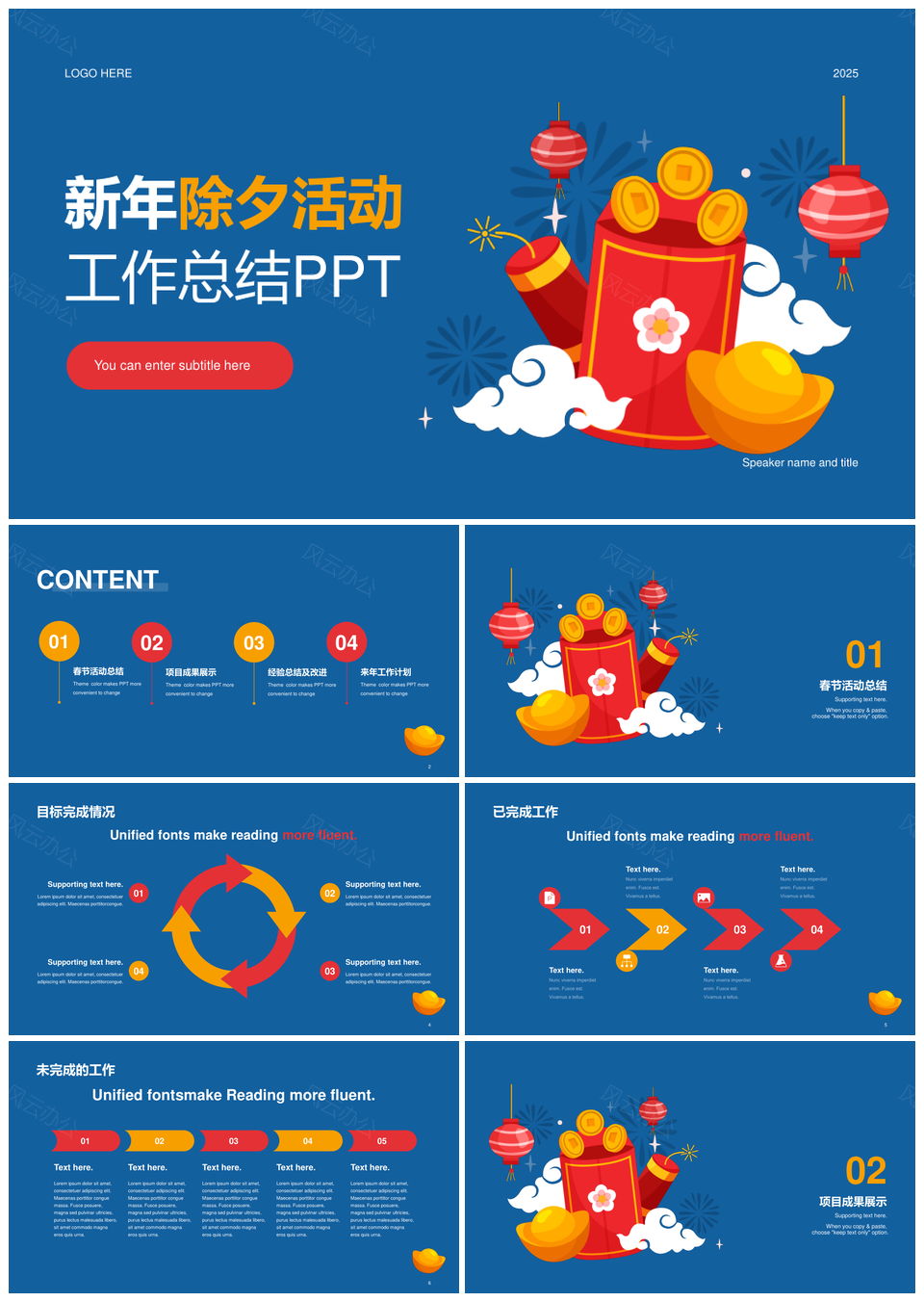 2025蓝色春节除夕红包鞭炮灯笼工作总结PPT模板