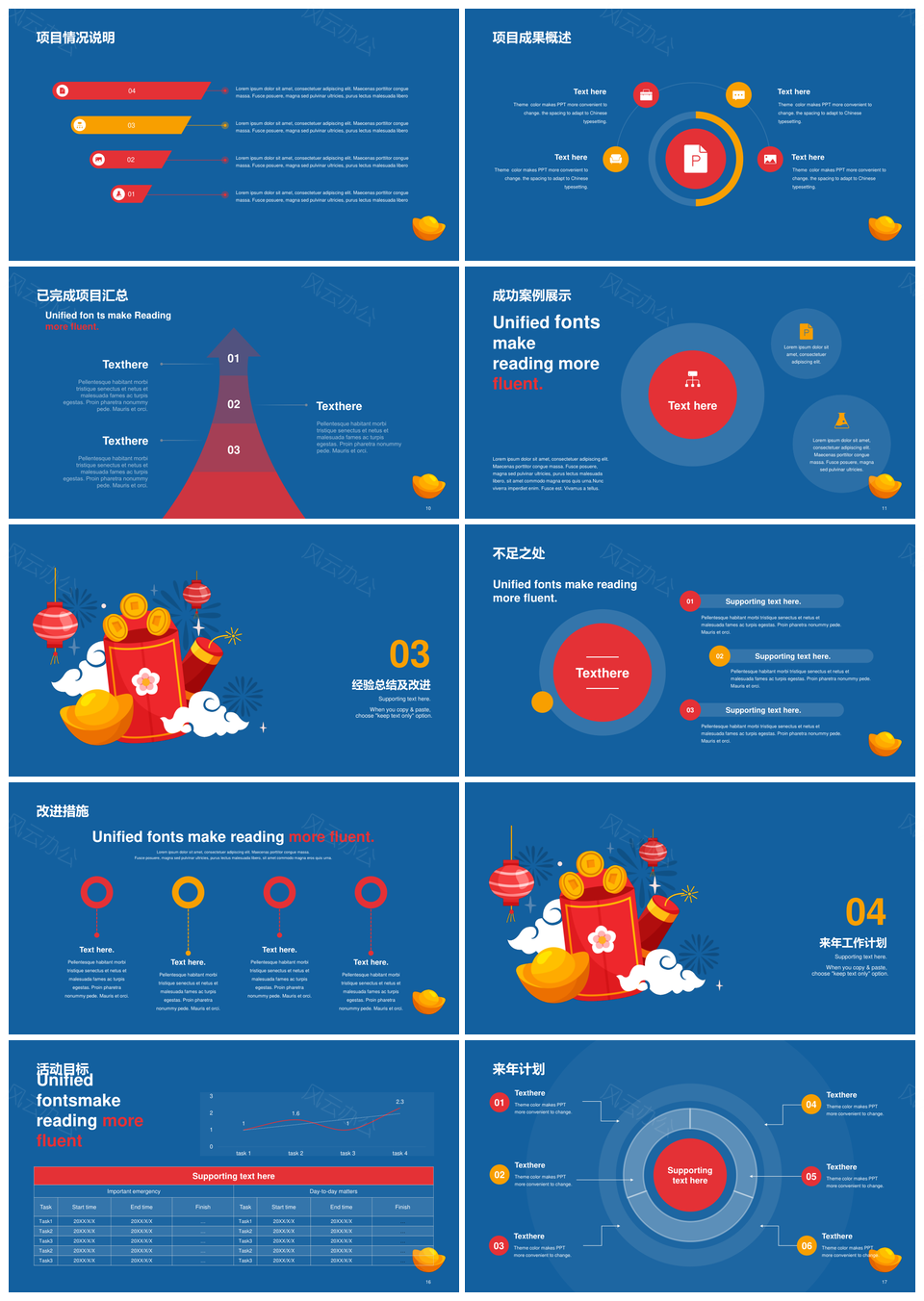 这款中国风PPT模板以正红,酒红为基调呈现节日氛围,深蓝,藏蓝营造商务场景的专业质感,浅蓝,灰蓝提升视觉层次。模块化排版兼容企业汇报,产品发布等多场景,内置一键配色系统支持15秒快速换色。原创矢量元素经6次细节校准,重点信息通过色块对比自动聚焦。页面预留通用版式区,用户可直接拖拽替换图文素材,文字层级与图标组合已预设智能对齐参数。模板经过职场场景实测,适配投影仪与电子屏双场景显示需求。
