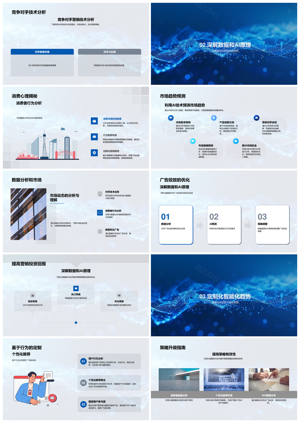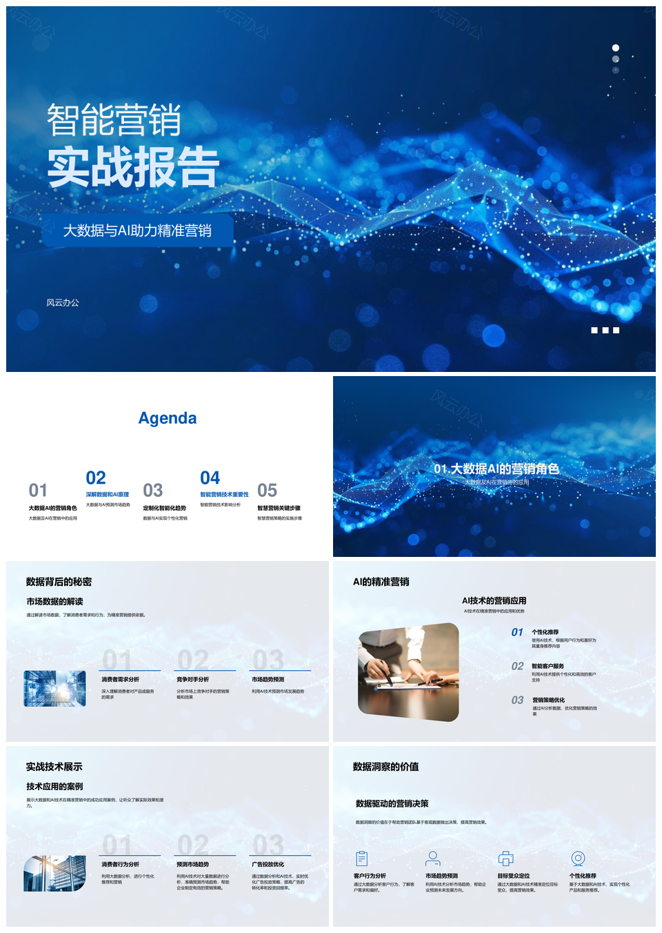 风云办公提供的智能营销AI大数据驱动精准策略优化PPT模板,下载格式为pptx,一共33页,作品中文字及图均可以修改和编辑,图片更改请在作品中右键图片并更换,文字修改请直接点击文字进行修改。