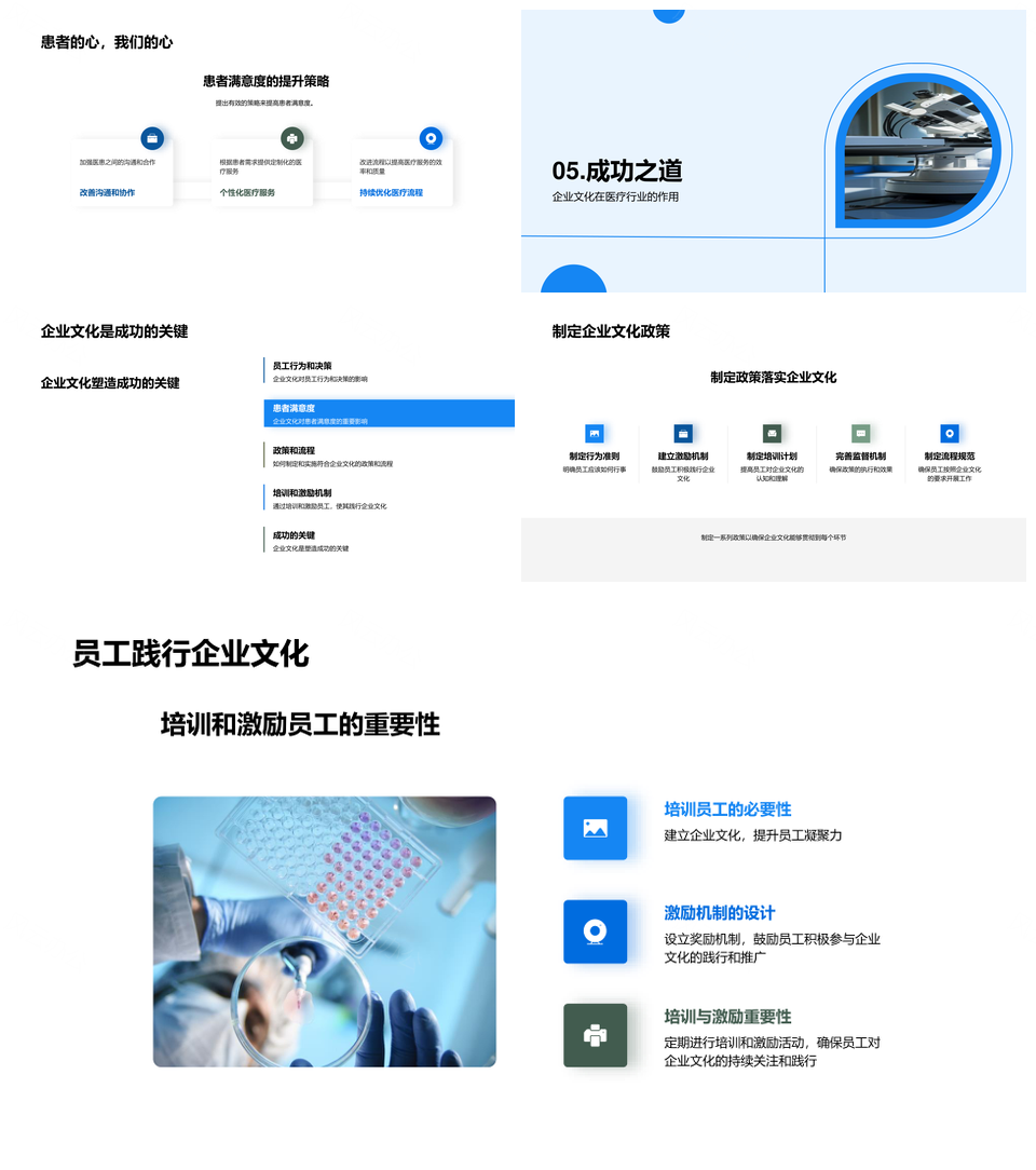 这是一张医疗企业文化建设提升服务质量与满意度PPT模板,包含医疗、企业文化、建设、提升、服务质量、满意度等主题内容,也可用作医疗企业文化建设提升服务质量、医疗企业文化建设提升满意度、企业文化建设提升服务质量、企业文化建设提升满意度、文化建设提升服务质量满意度、医疗企业服务质量提升、文化建设提升满意度、提升服务质量满意度、医疗企业文化建设、企业服务质量提升、服务质量满意度、企业文化建设、医疗服务质量、提升满意度、医疗企业服务等PPT场景使用。 风云办公提供的医疗企业文化建设提升服务质量与满意度PPT模板,下载格式为pptx,一共23页,作品中文字及图均可以修改和编辑,图片更改请在作品中右键图片并更换,文字修改请直接点击文字进行修改。