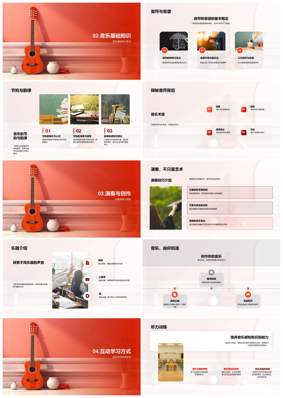 风云办公提供的一年级音乐启蒙乐理节拍演奏乐器教学PPT模板,下载格式为pptx,一共24页,作品中文字及图均可以修改和编辑,图片更改请在作品中右键图片并更换,文字修改请直接点击文字进行修改。