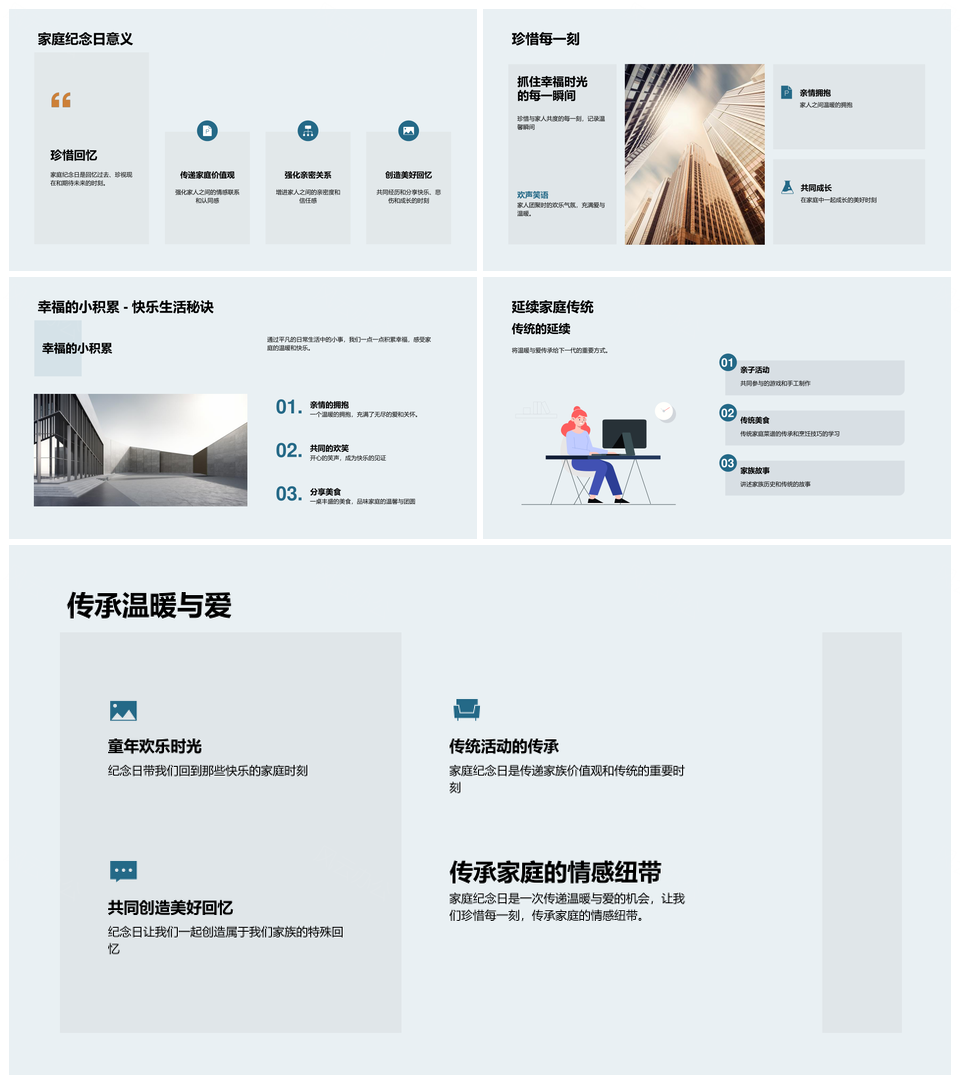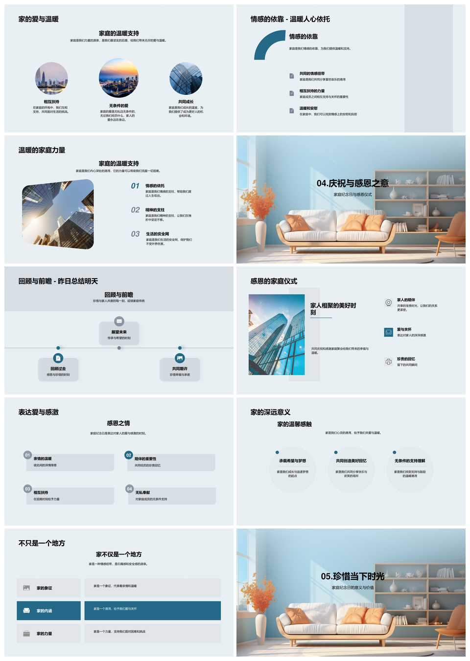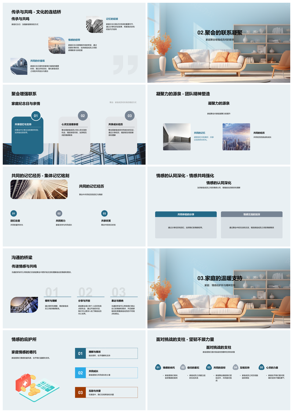 这是一张家庭温情凝聚力纪念聚会传承共鸣庇护所PPT模板,包含家庭、温情、凝聚力、纪念、聚会、传承、共鸣、庇护所等主题内容,也可用作家庭温情凝聚力纪念聚会传承、温情凝聚力纪念聚会传承、凝聚力纪念聚会传承共鸣、家庭温情纪念聚会传承、温情纪念聚会传承共鸣、纪念聚会传承共鸣庇护所、家庭温情凝聚力庇护所、温情凝聚力传承共鸣、家庭纪念聚会庇护所、凝聚力聚会传承共鸣、温情聚会传承庇护所、家庭凝聚力纪念、温情纪念共鸣、聚会传承庇护所、家庭温情共鸣等PPT场景使用。 风云办公提供的家庭温情凝聚力纪念聚会传承共鸣庇护所PPT模板,下载格式为pptx,一共33页,作品中文字及图均可以修改和编辑,图片更改请在作品中右键图片并更换,文字修改请直接点击文字进行修改。